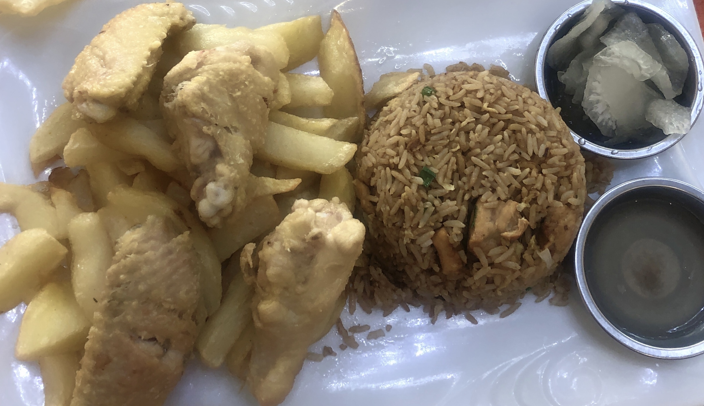 Arroz chaufa, papas fritas, cortes de pollo, cebolla y tomate salteado.