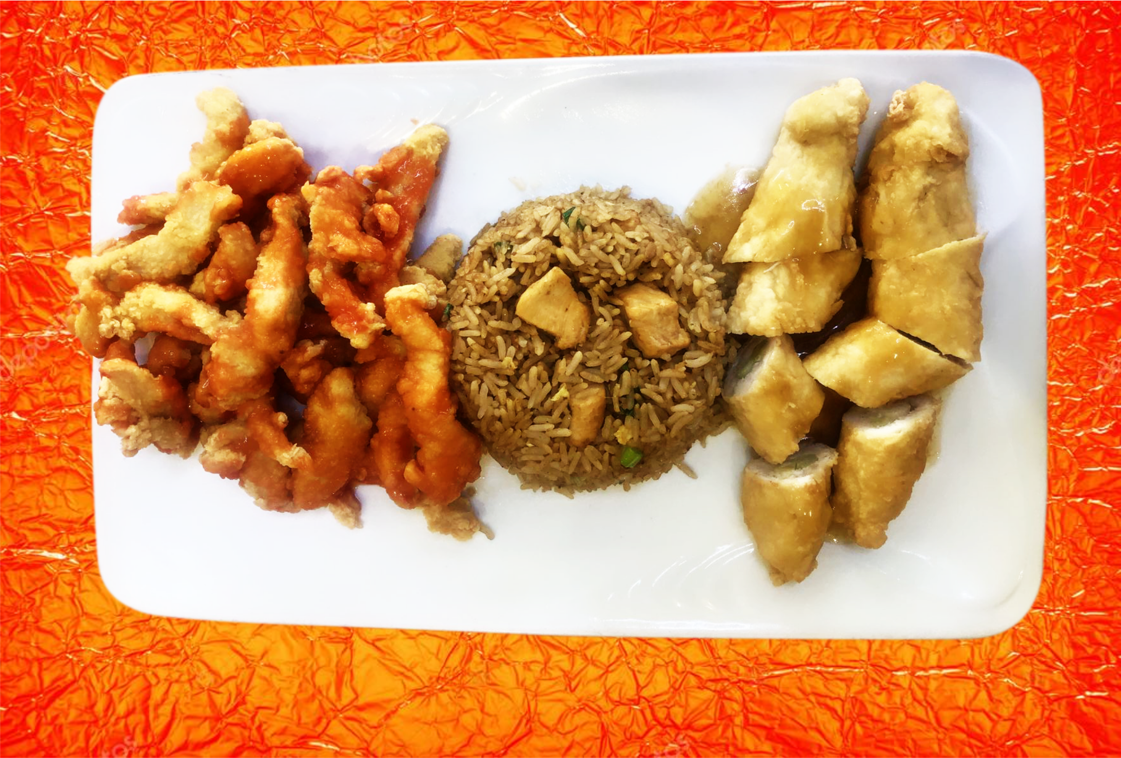 Arroz chaufa, pechuga de pollo frito, rellenos con verduras, apanado con harina y chuño en salsa ostión.