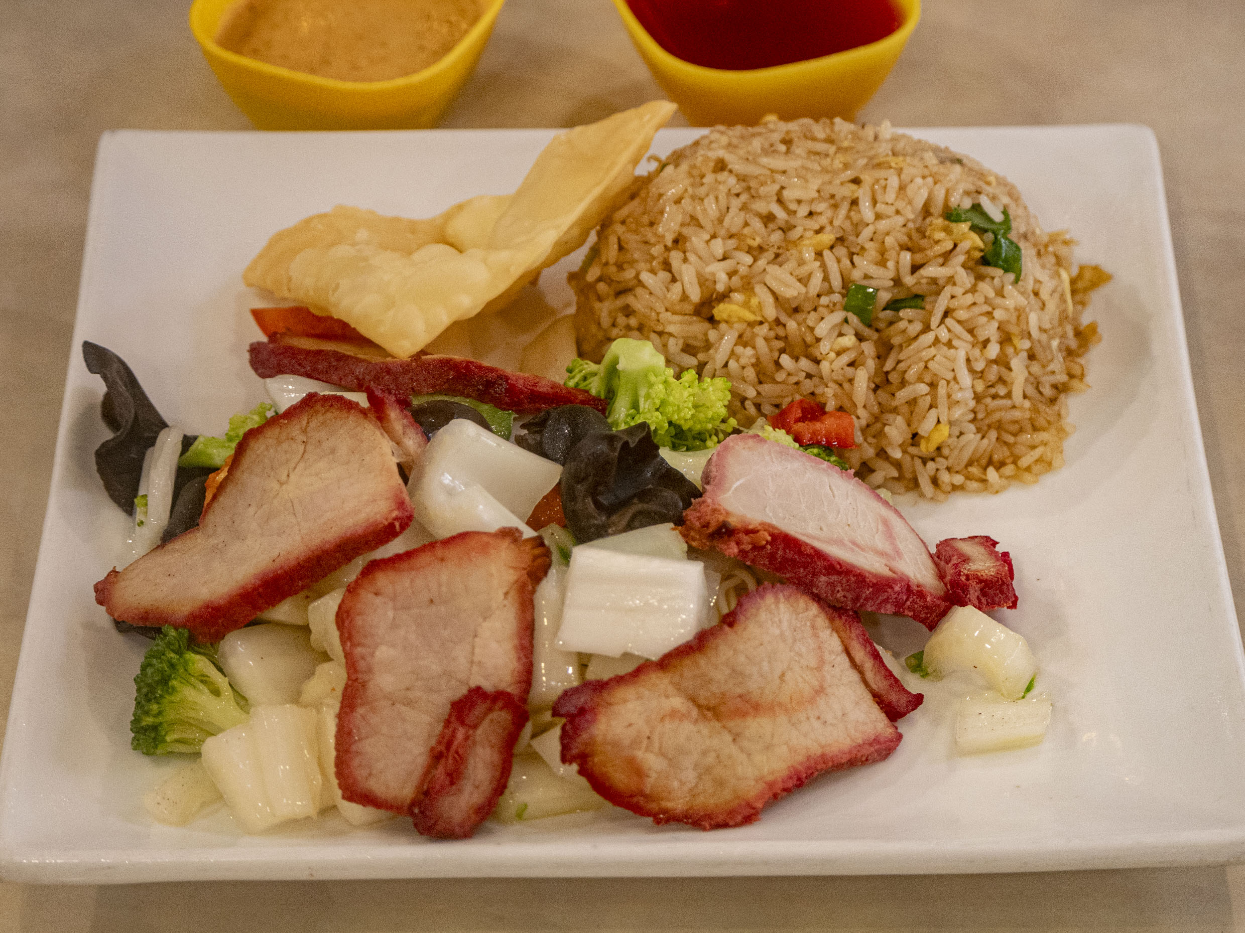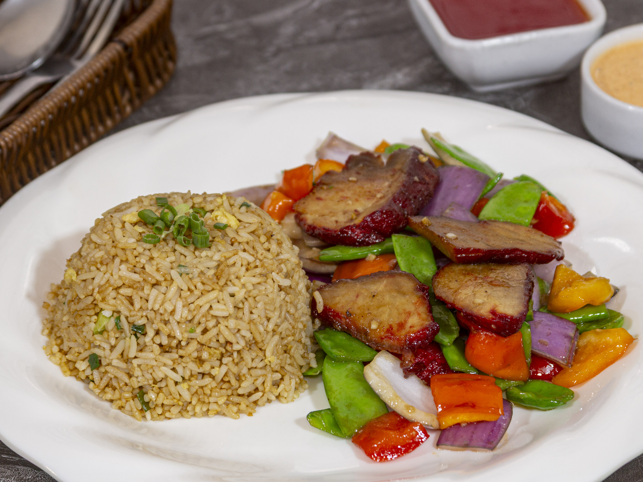 Arroz chaufa y cortes de chancho con verduras picadas en salsa de ostión.