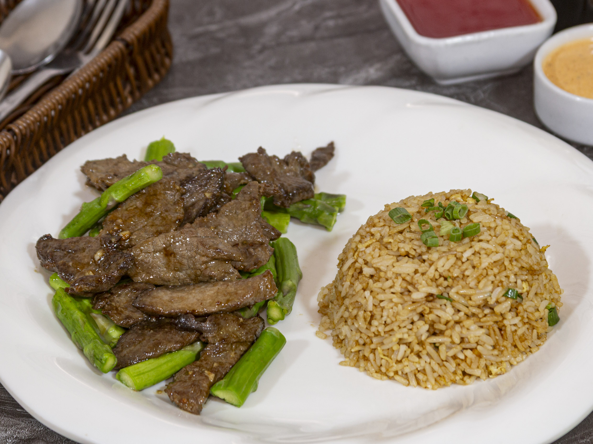 Cortes de carne, arroz salteado, aceite de ajonjolí, sillao, huevo y cebolla china.