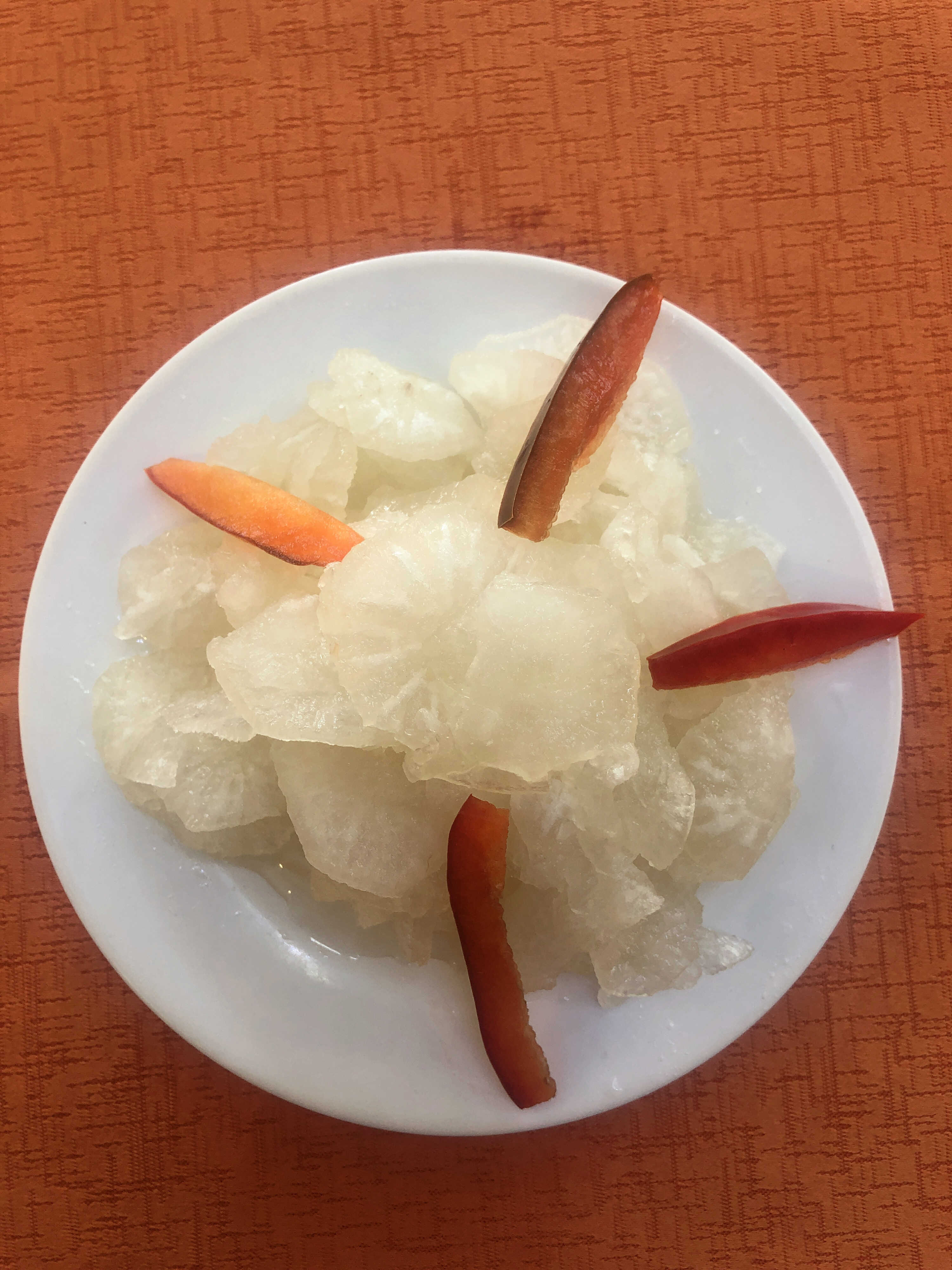 6 Siu mai, 6 suikao fritos, porción de chancho asado y nabo encurtido.