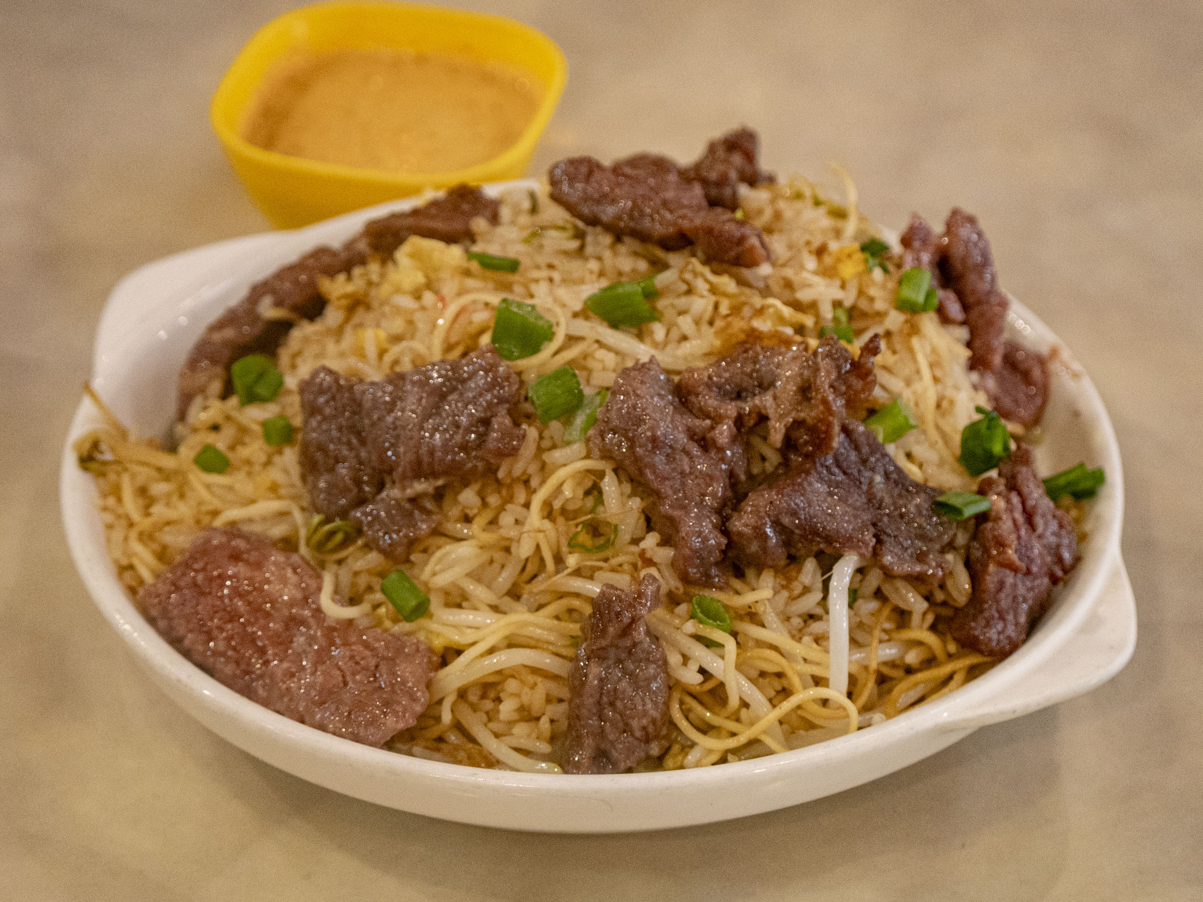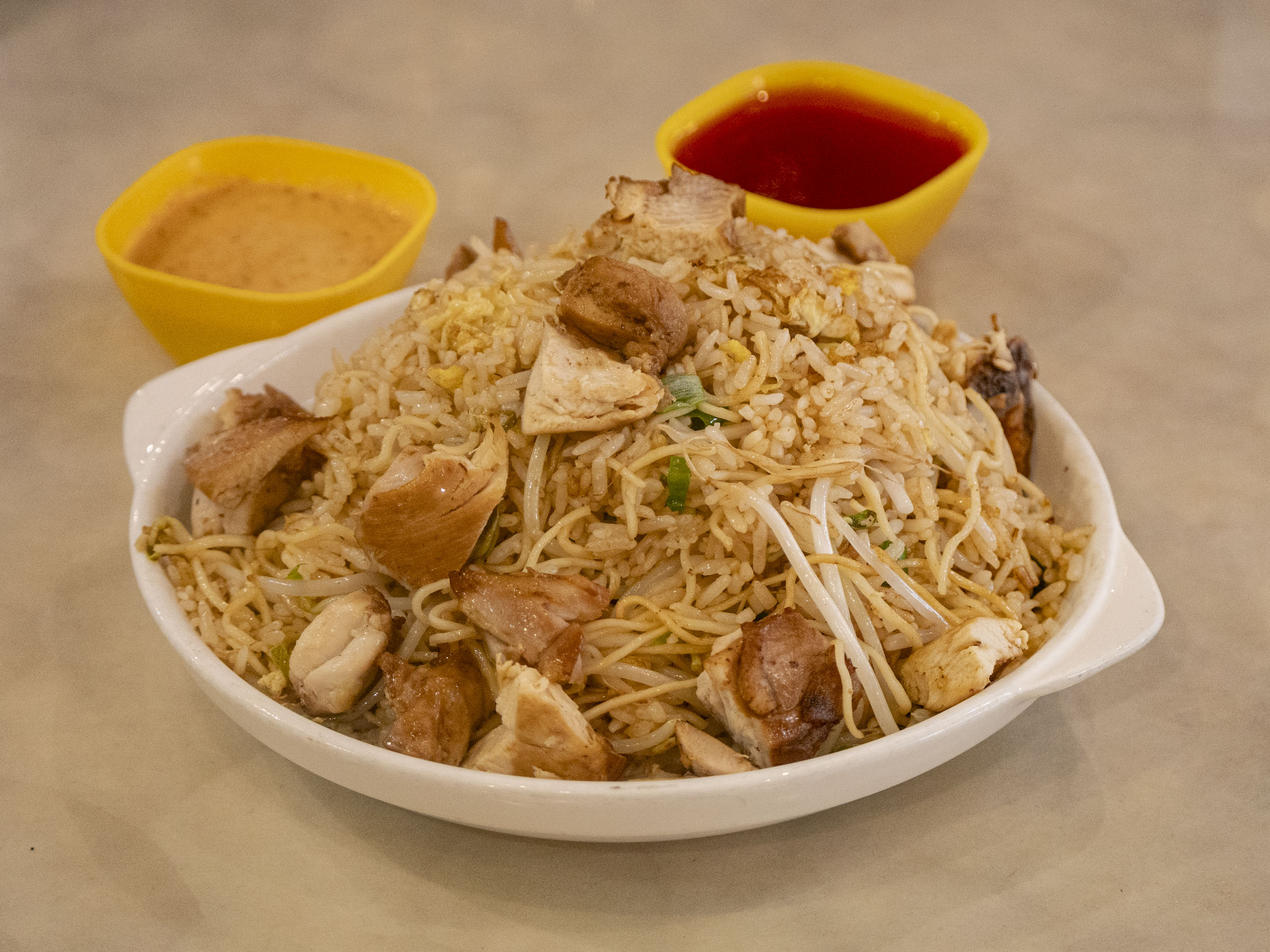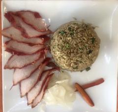 Arroz chaufa, cortes de chancho, holantao y tausi, salteado en salsa ostión.