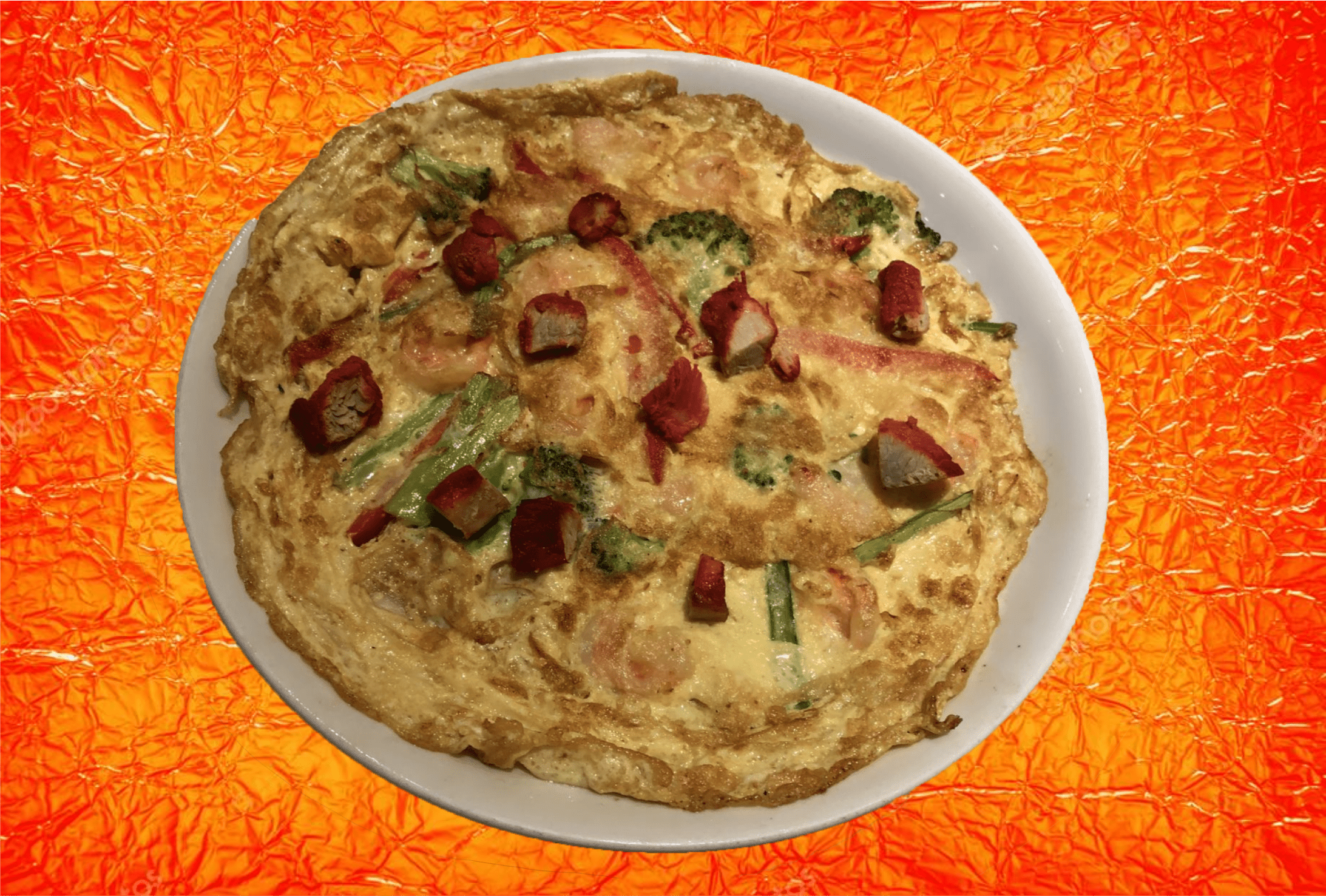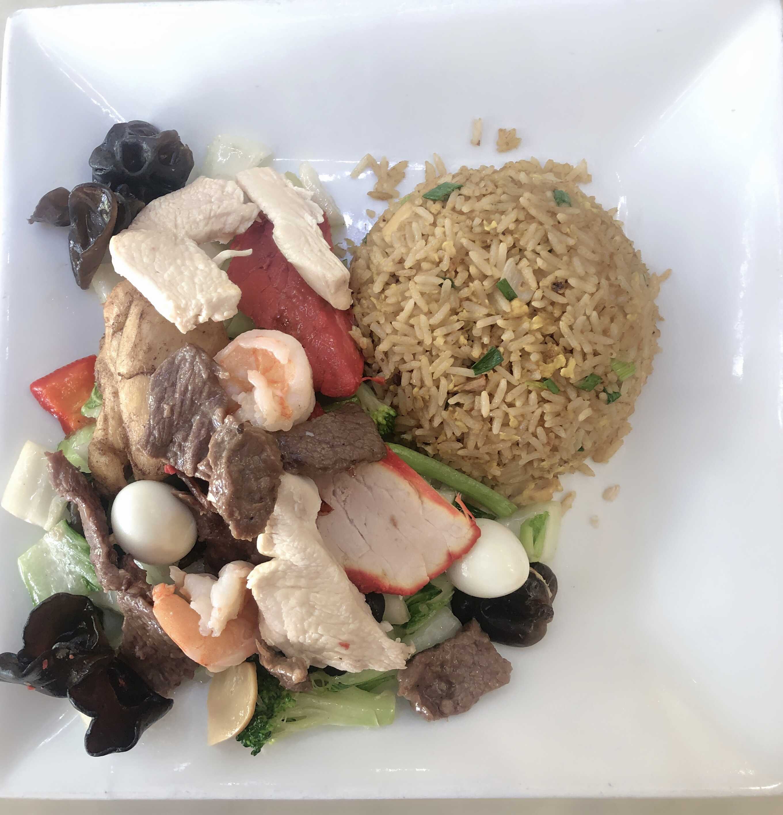 Cortes de chancho, pollo, carne, langostinos, verduras, holantao, yuyo, champiñones y huevitos de codorniz, salteado en salsa de ostión.