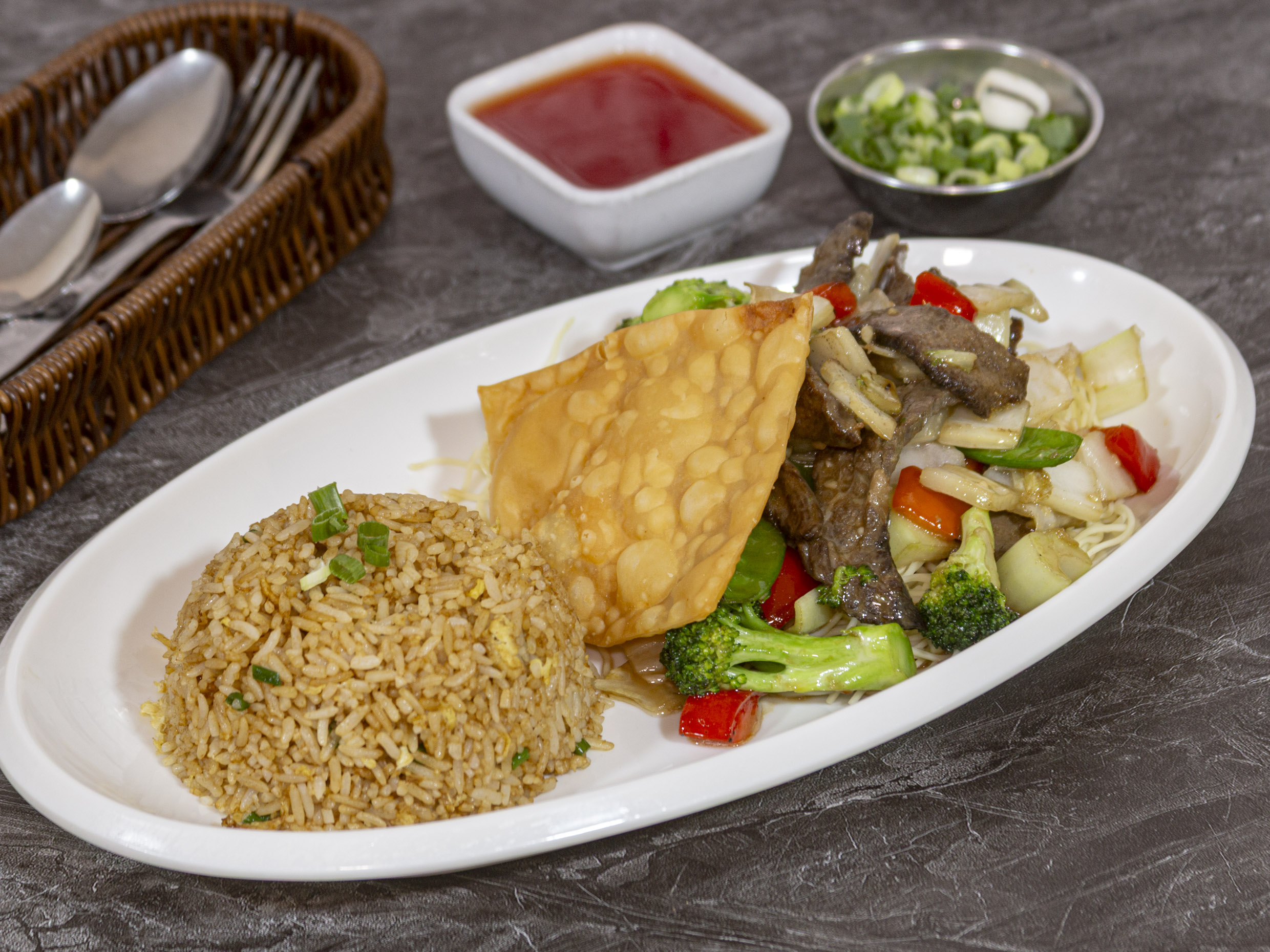 Arroz chaufa, tallarín, cortes de carne, verduras y frijolito chino, salteado en salsa de ostión más wantán frito.