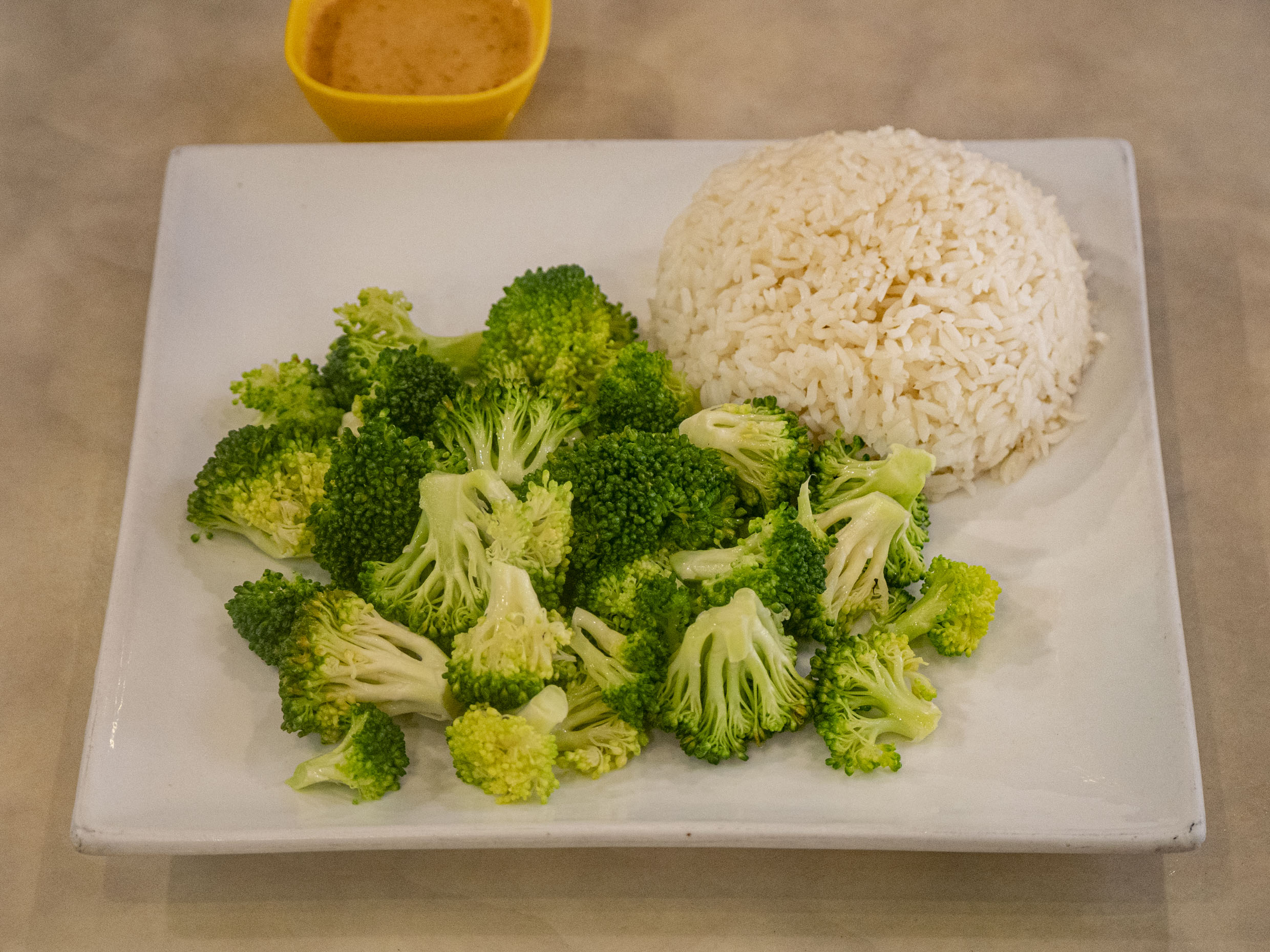 Plato Personal/Cortes de pollo, arroz salteado, aceite de ajonjolí, sillao, huevo y cebolla china + acompañamiento a elegir