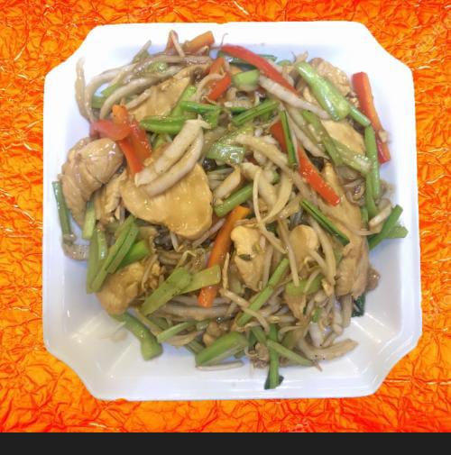 Tiras de pollo, verduras, yuyo, champiñones y frijolito chino salteado en salsa de ostión.