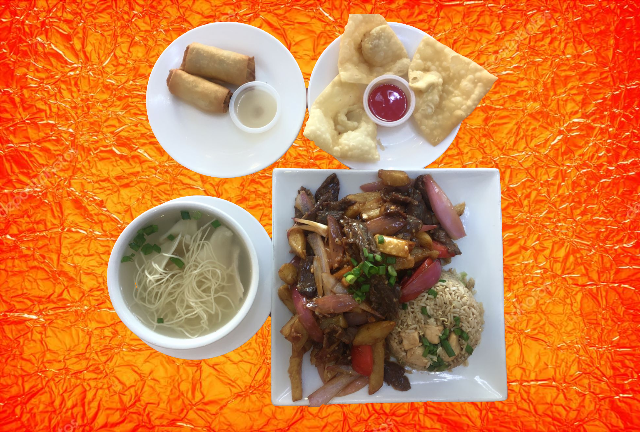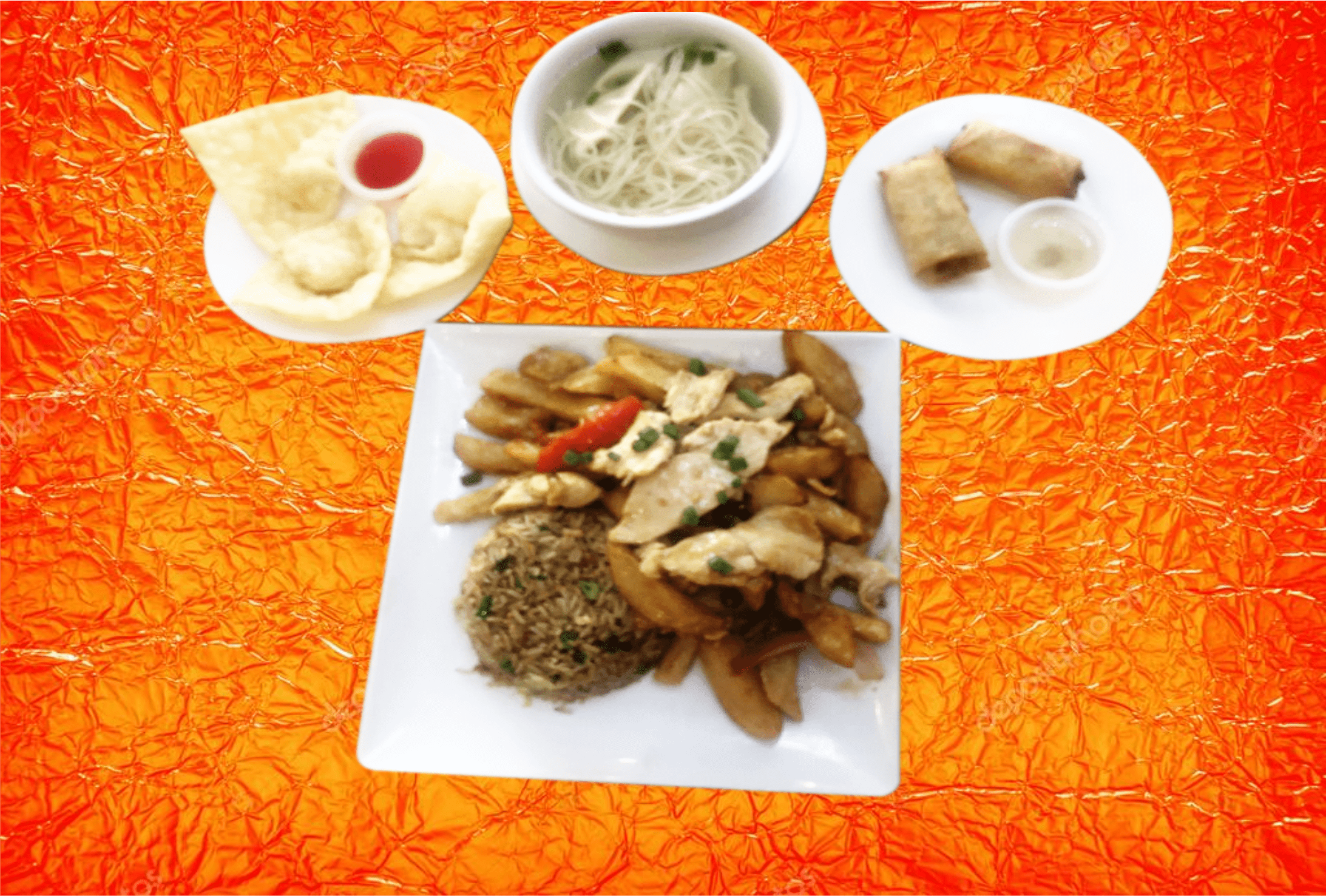 Wantán media docena, pollo chijaukay, pollo durazno, chaufa y bebida gaseosa de 500 ml.
