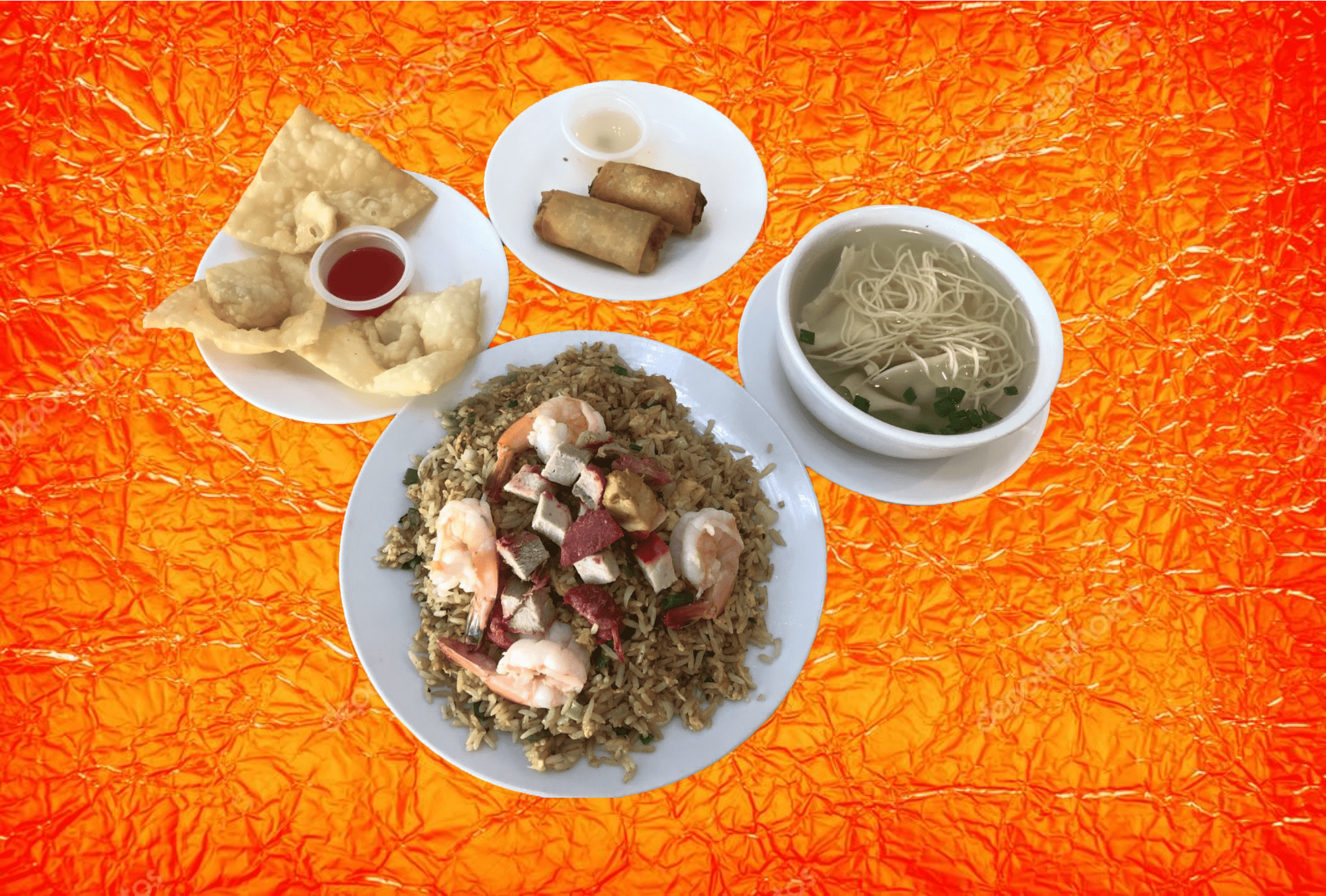 Arroz chaufa, tallarín, cortes de pollo, chancho, carne, langostinos, verduras y frijolito chino, salteado en salsa de ostión más wantán frito.