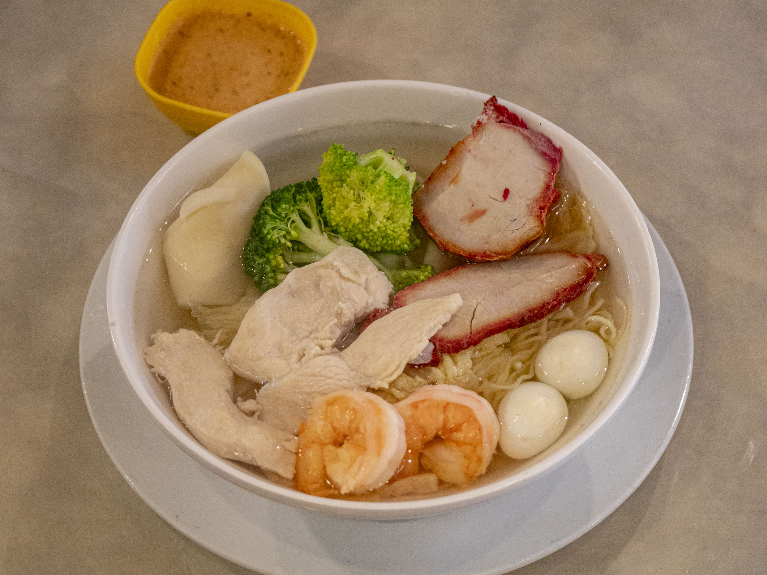 Cortes de pollo, chancho, langostinos, verduras, yuyo, champiñones, huevitos de codorniz, wantán, tallarín, decorado con pequeños cortes de cebolla china y sopa de pollo.