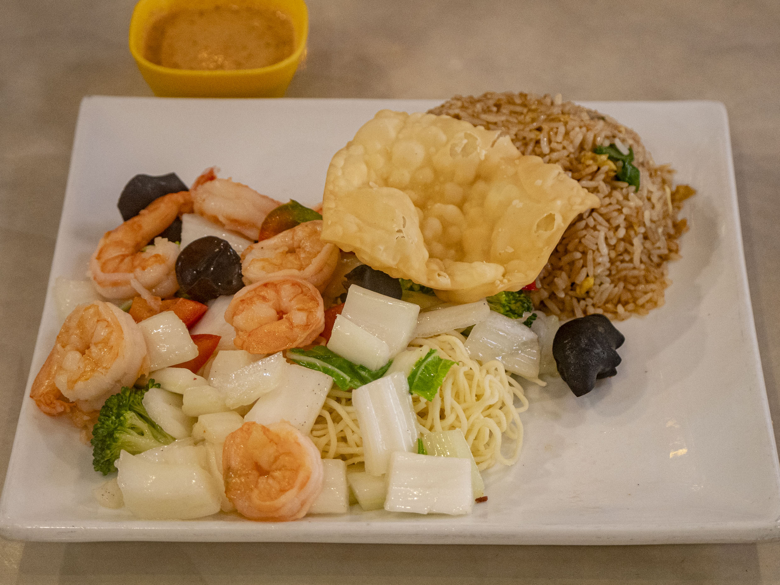 Arroz chaufa, tallarín, langostinos, verduras y frijolito chino, salteado en salsa ostión más wantán frito.