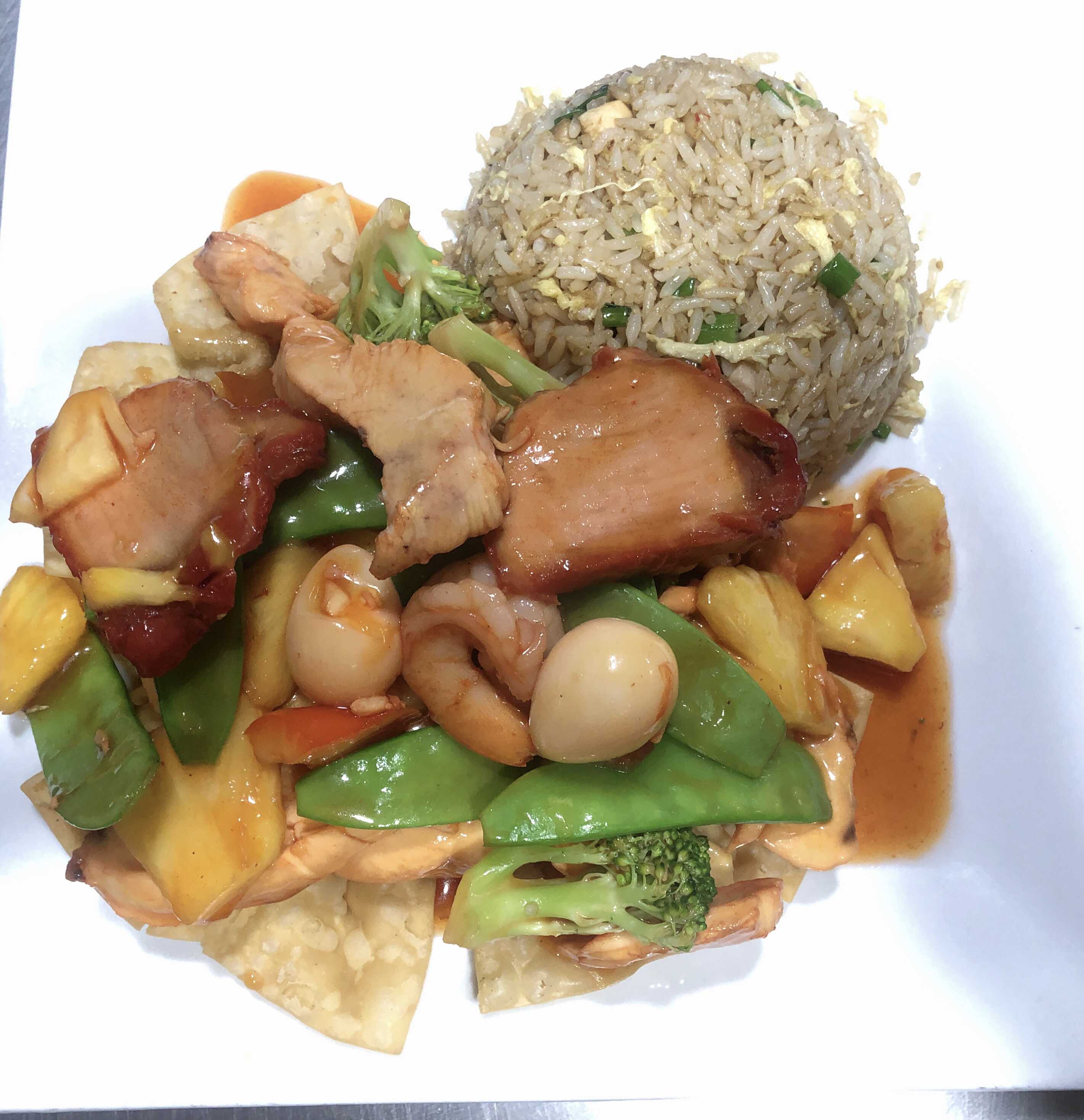 Cortes de chancho, pollo, carne, langostinos, verduras, holantao, yuyo, champiñones y huevitos de codorniz, salteado en salsa de ostión.