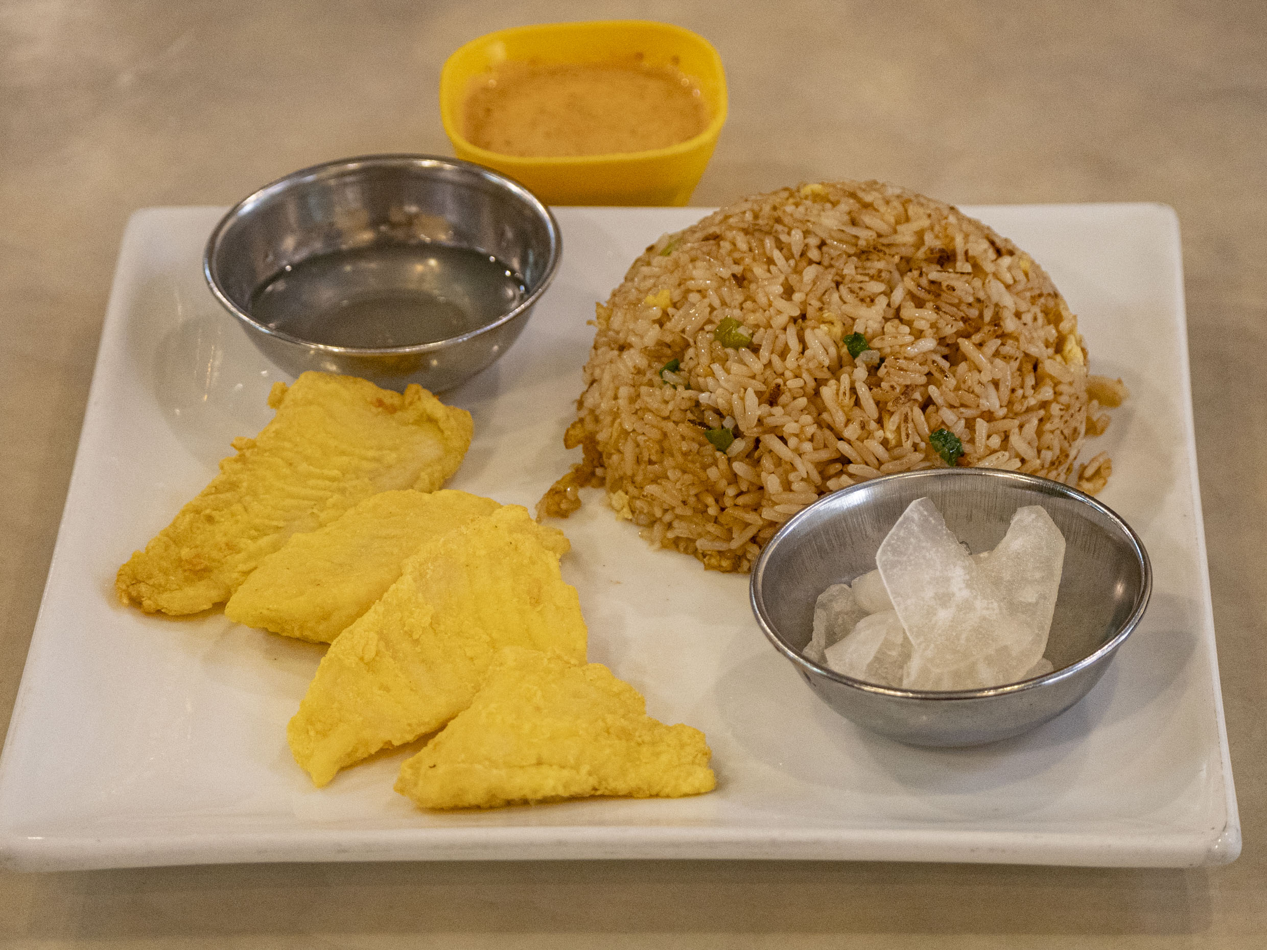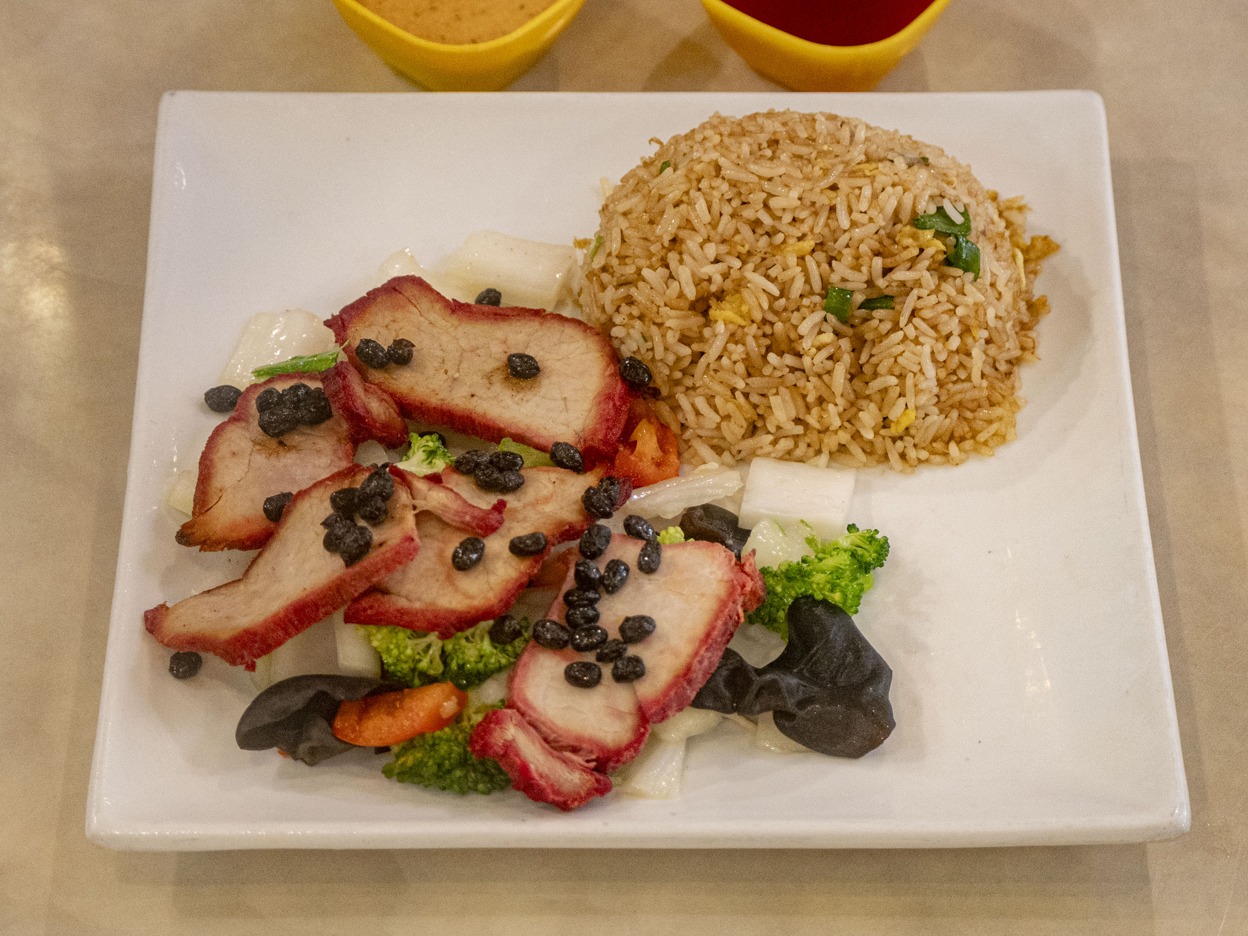 Arroz chaufa, cortes de chancho, holantao y tausi, salteado en salsa ostión.