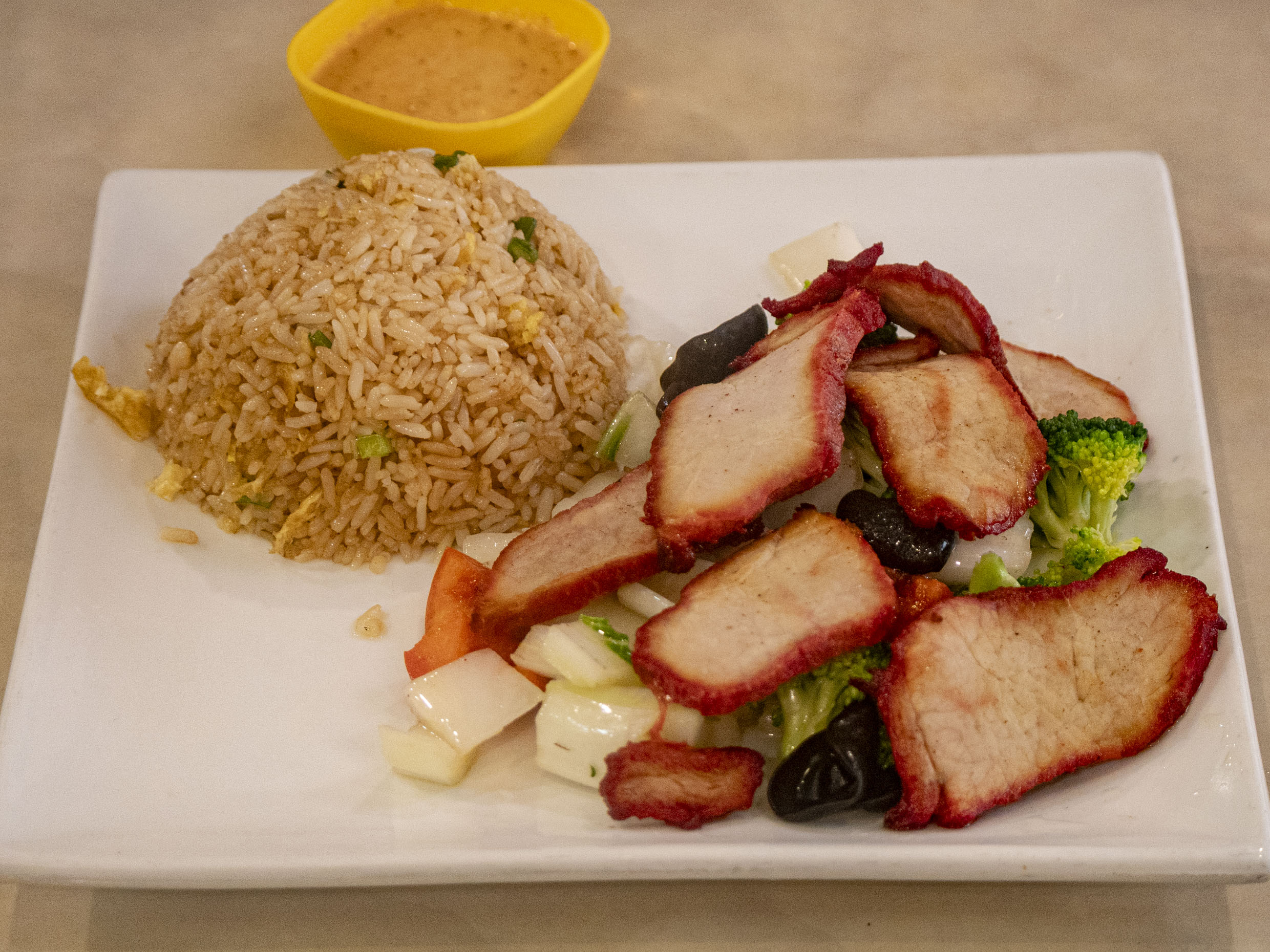 Arroz chaufa y cortes de chancho con verduras picadas en salsa de ostión.