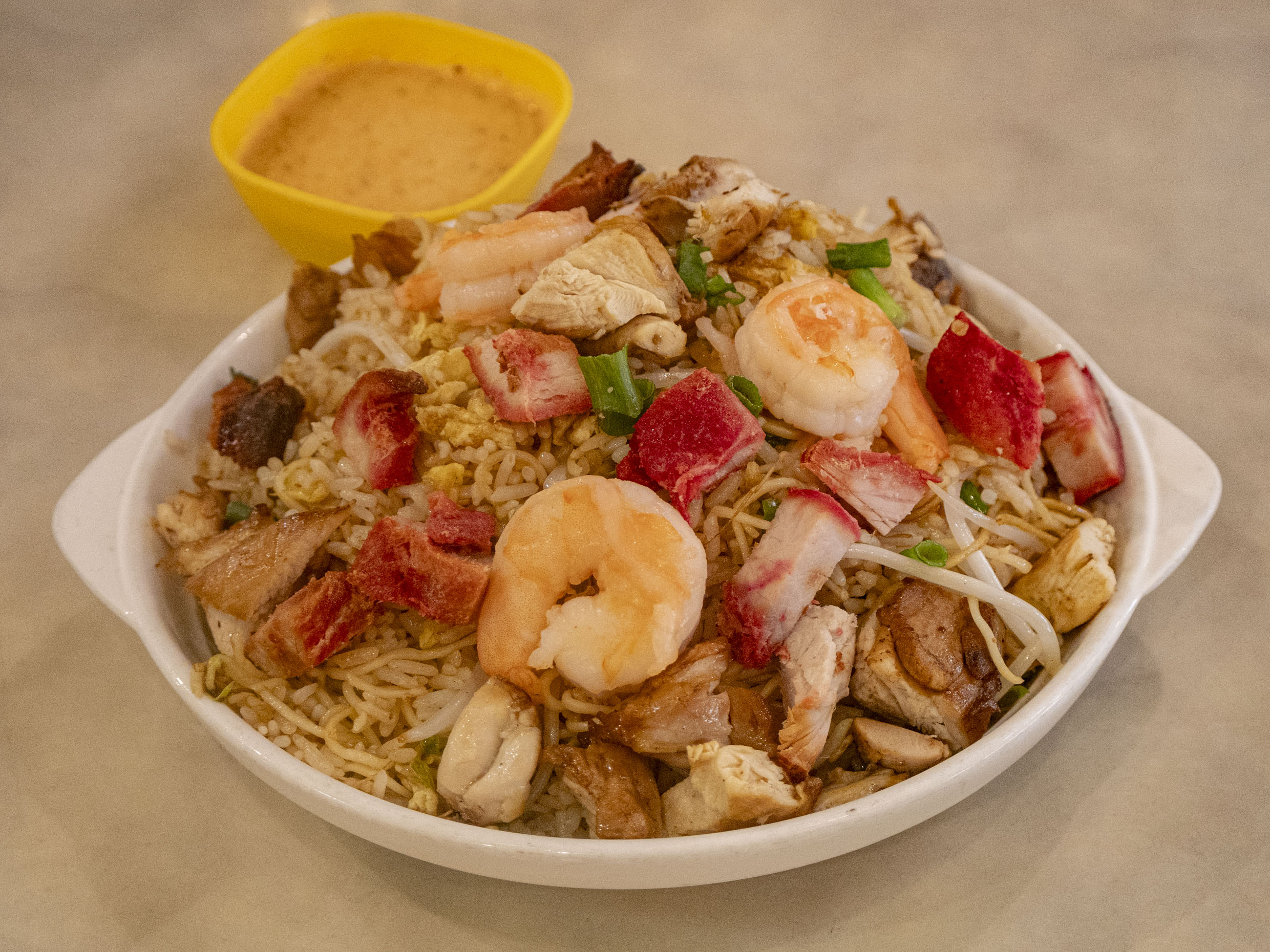 Arroz chaufa, tallarín, cortes de pollo, chancho, carne, langostinos, verduras y frijolito chino, salteado en salsa de ostión más wantán frito.
