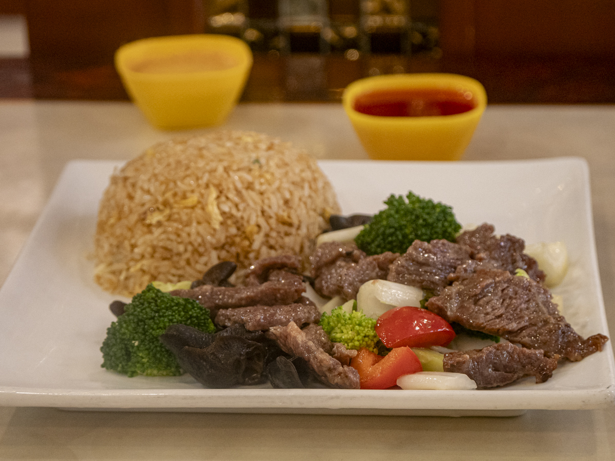 Cortes de carne, verduras, yuyo, champiñones y frijolito chino salteado en salsa de ostión.