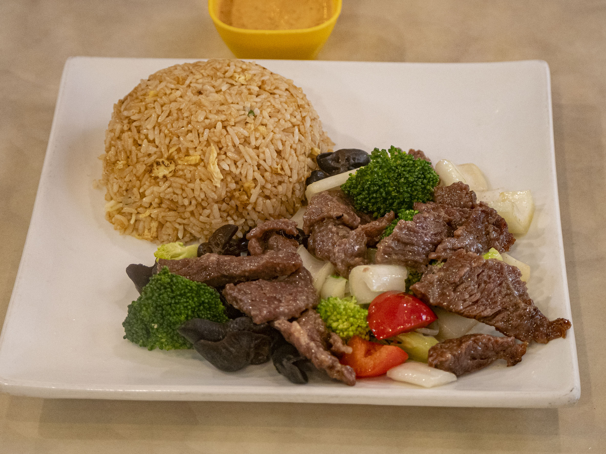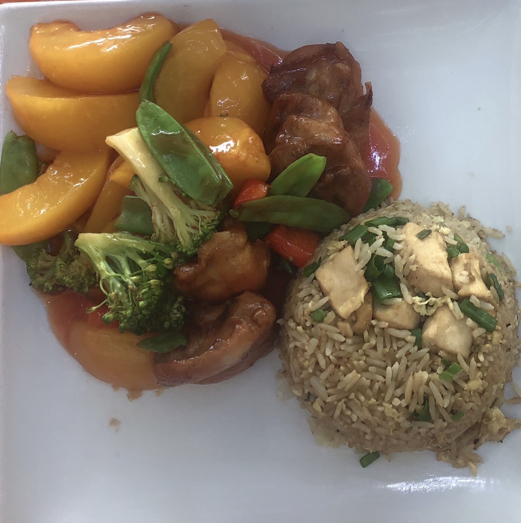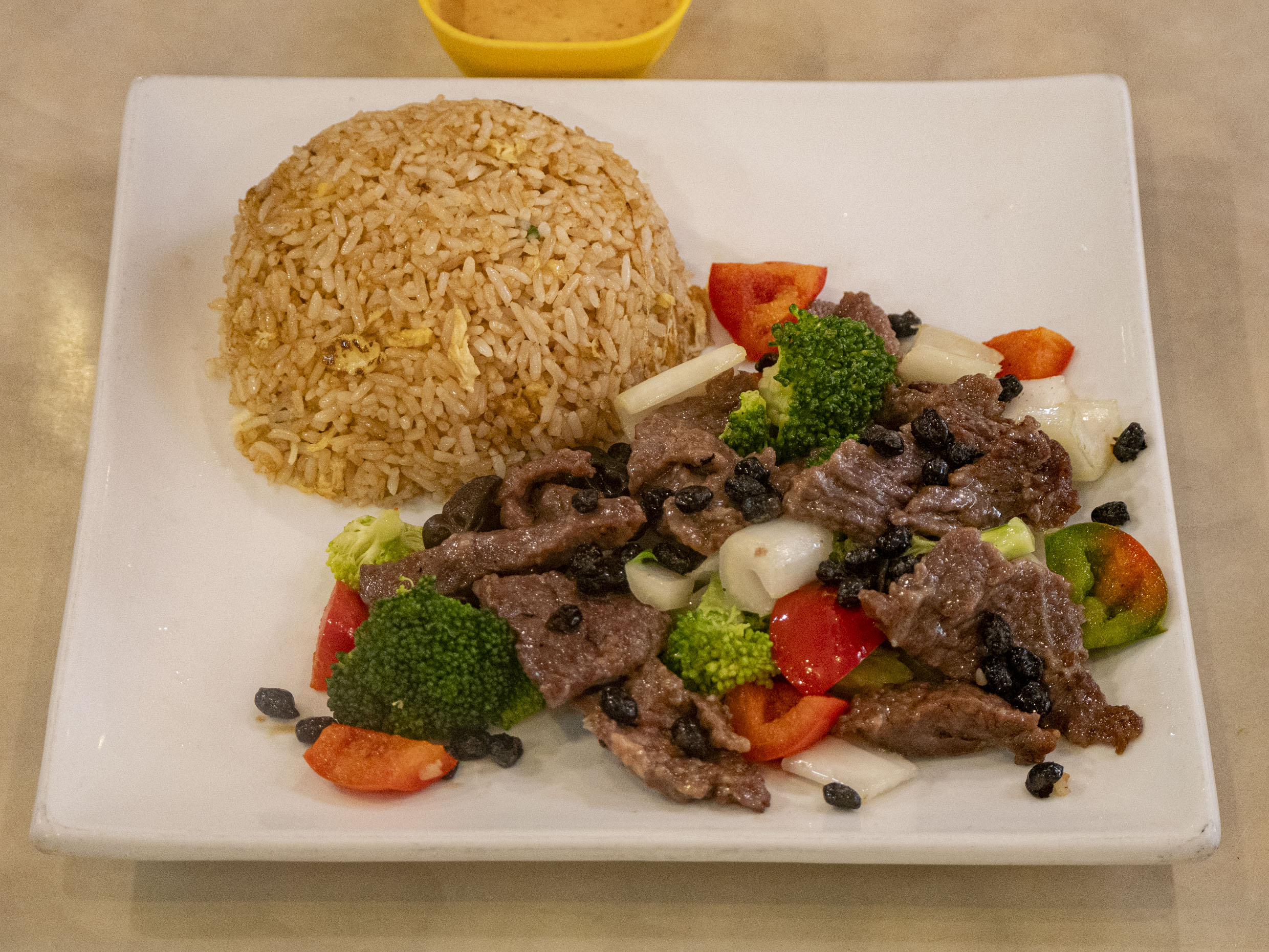 Arroz chaufa, pollo en trozo, tausi y verduras salteadas con salsa ostión.