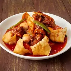 Wantanes fritos con pollo, cerdo, verduras y frutas en salsa agridulce.