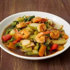 Trozos de langostino salteados al wok con verduras frescas en salsa oriental.