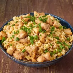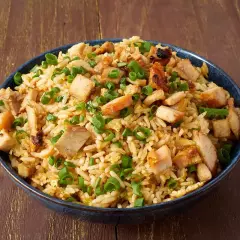 Arroz frito al wok con trozos de pollo, huevo, cebolla china y salsa de soya.