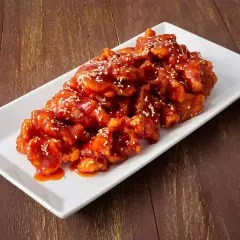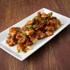 Trozos de pollo frito bañados en una salsa agridulce.