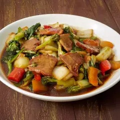 Trozos de chancho salteados al wok con verduras frescas en salsa oriental.