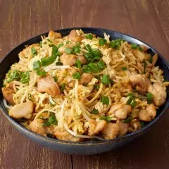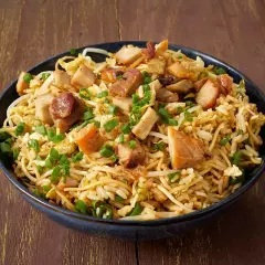 Arroz frito con tallarines al wok con trozos de pollo, huevo, cebolla china y salsa de soya.