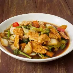 Trozos de pollo salteados al wok con verduras frescas en salsa oriental.
