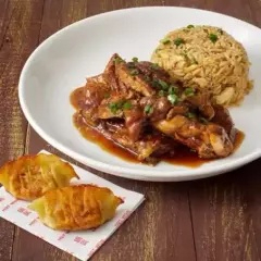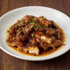 Pollo frito crujiente cubierto con una sabrosa salsa de sillao, kión y verduras.