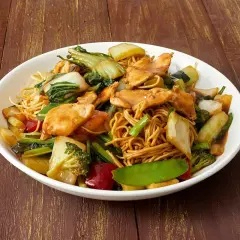 Fideos salteados al wok con pollo, verduras y salsa de soya al estilo oriental.