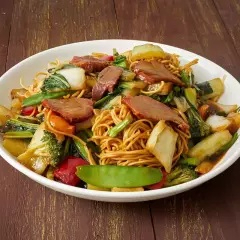 Arroz frito con tallarines al wok con trozos de chancho, huevo, cebolla china y salsa de soya.