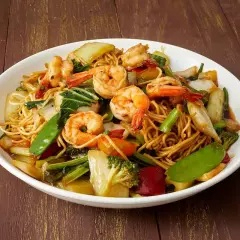 Fideos salteados al wok con langostinos, verduras y salsa de soya al estilo oriental.