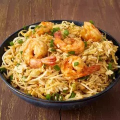 Arroz frito con tallarines al wok, con trozos de langostinos, huevo, cebolla china y salsa de soya.