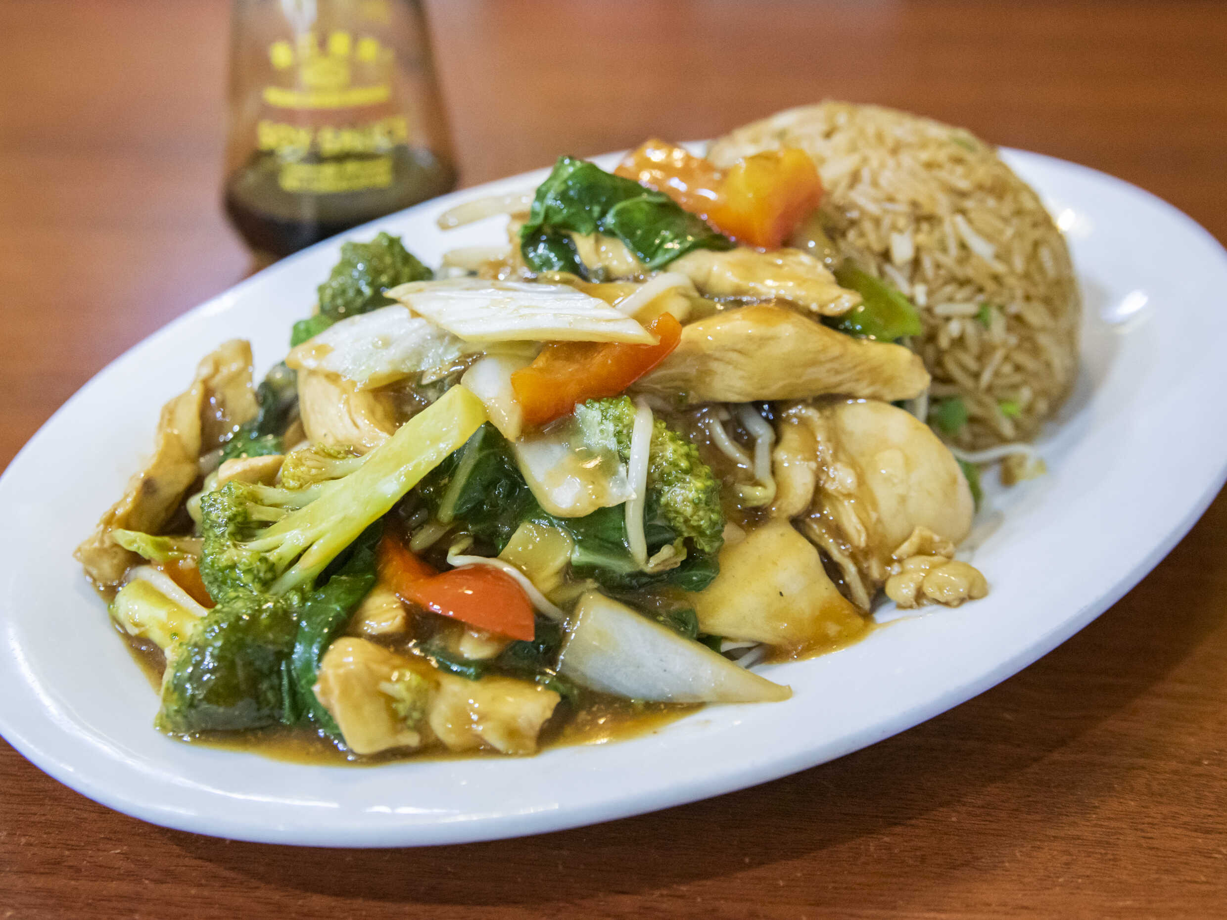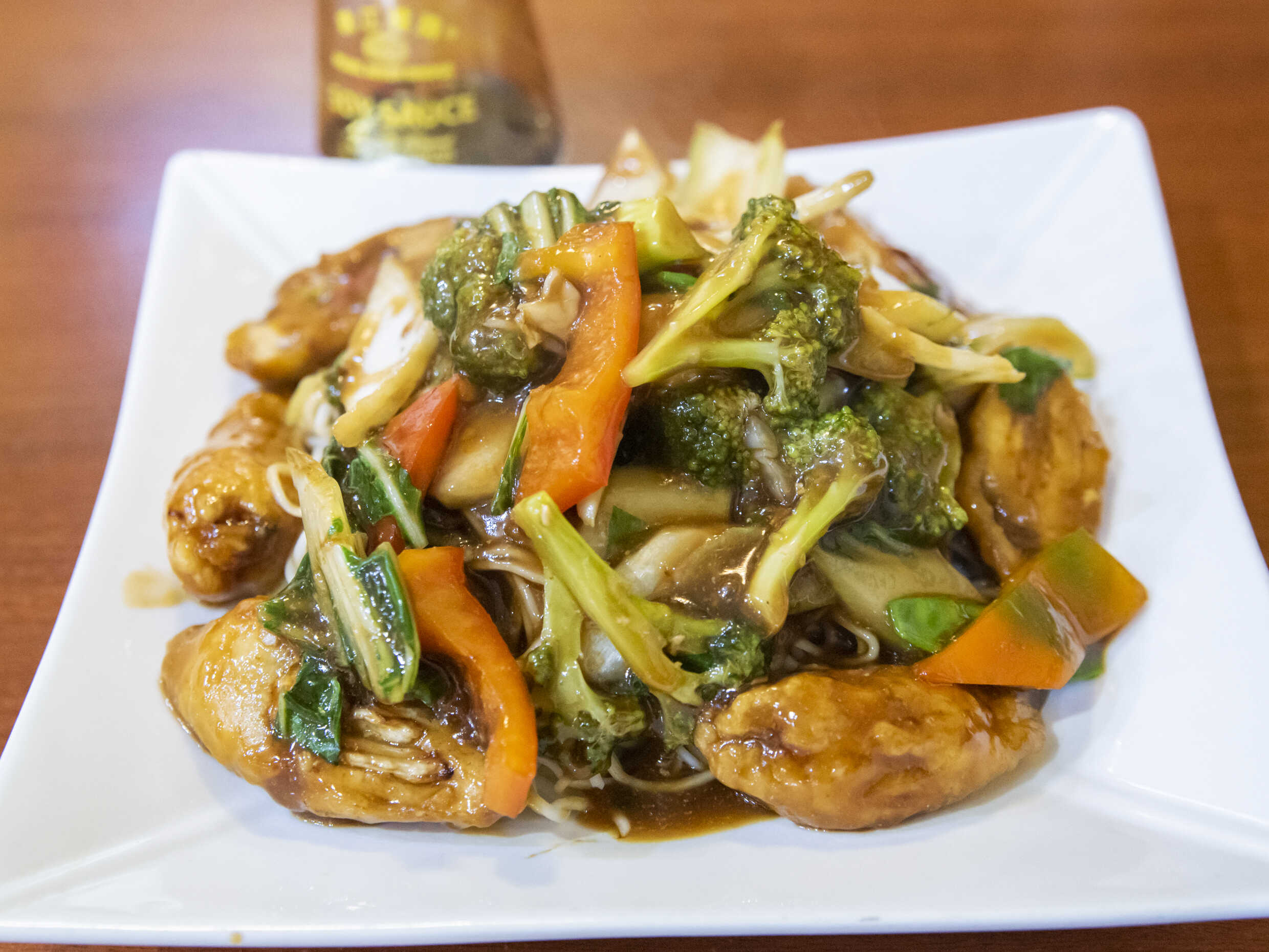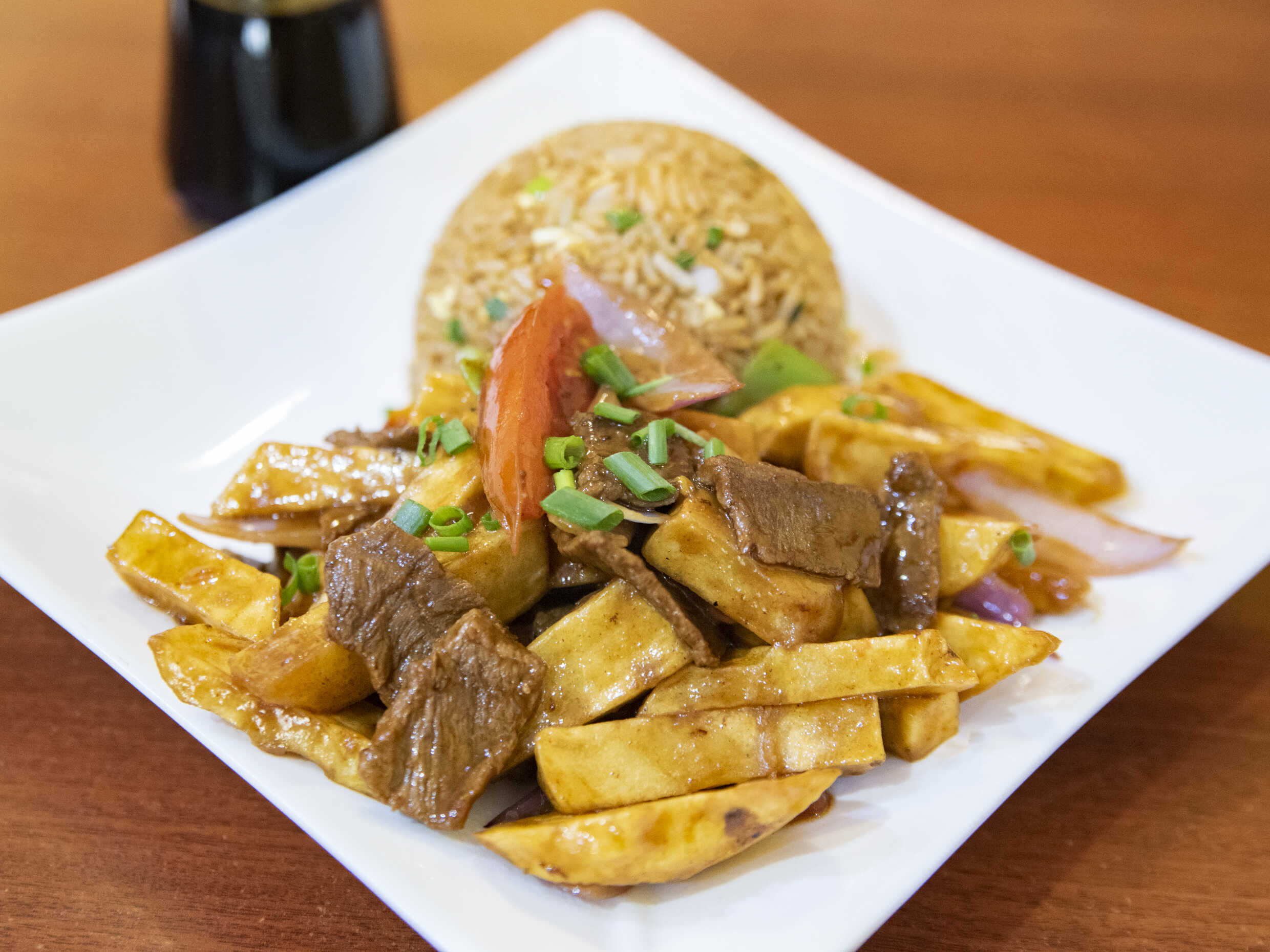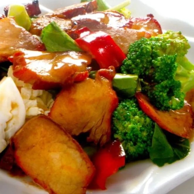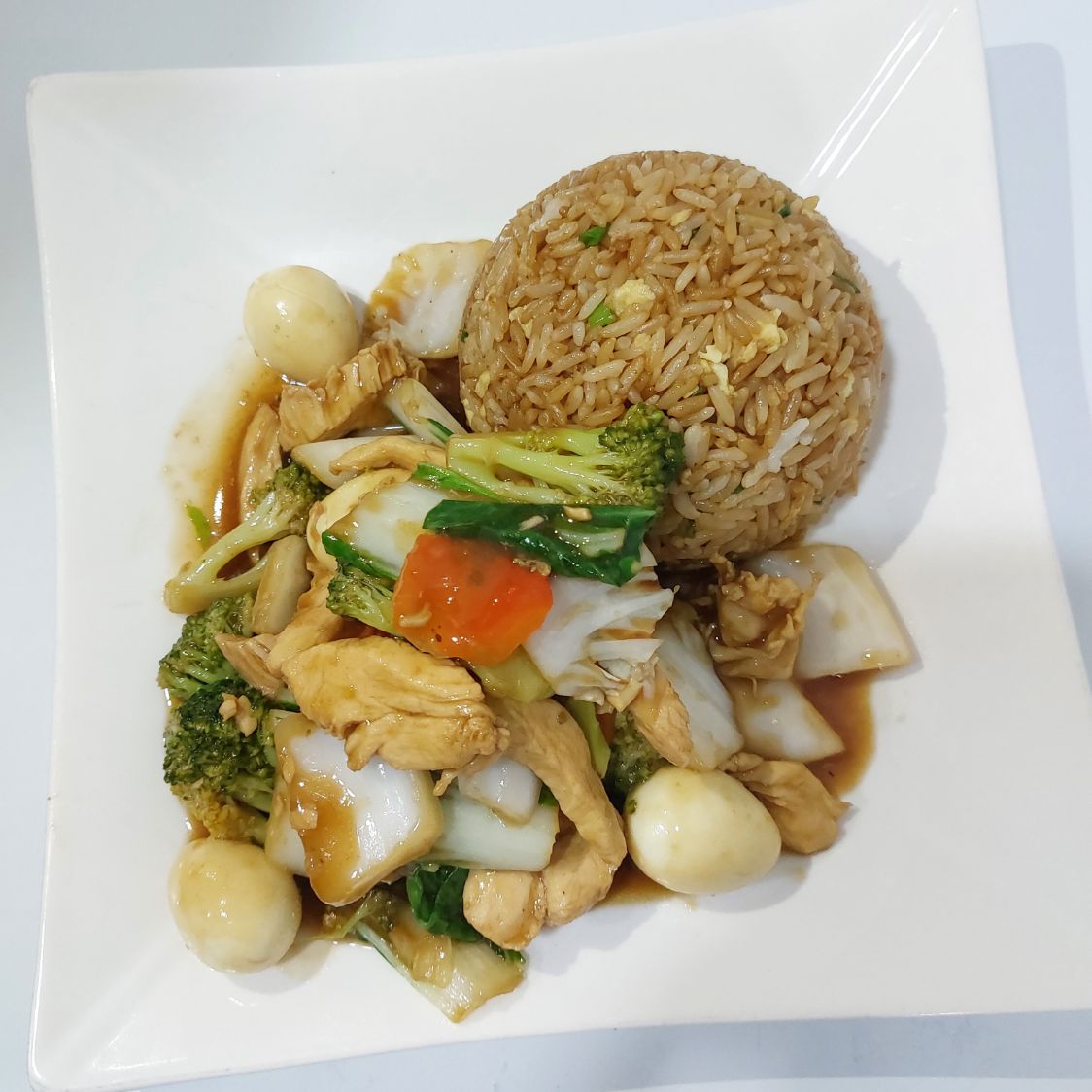 Trozos de pollo bañadas en salsa de sillao, chaufa, verduras chinas y huevo de codorniz.