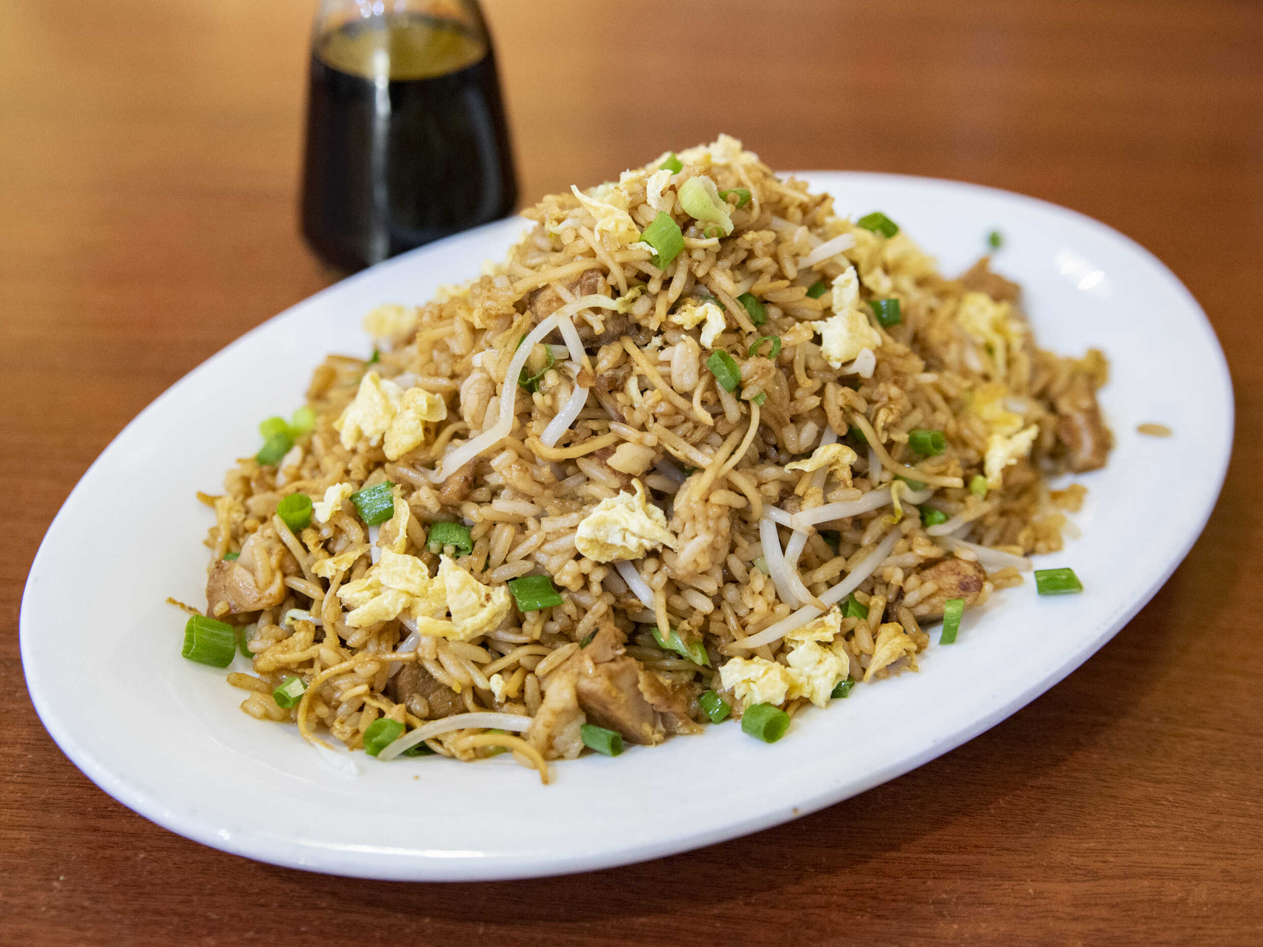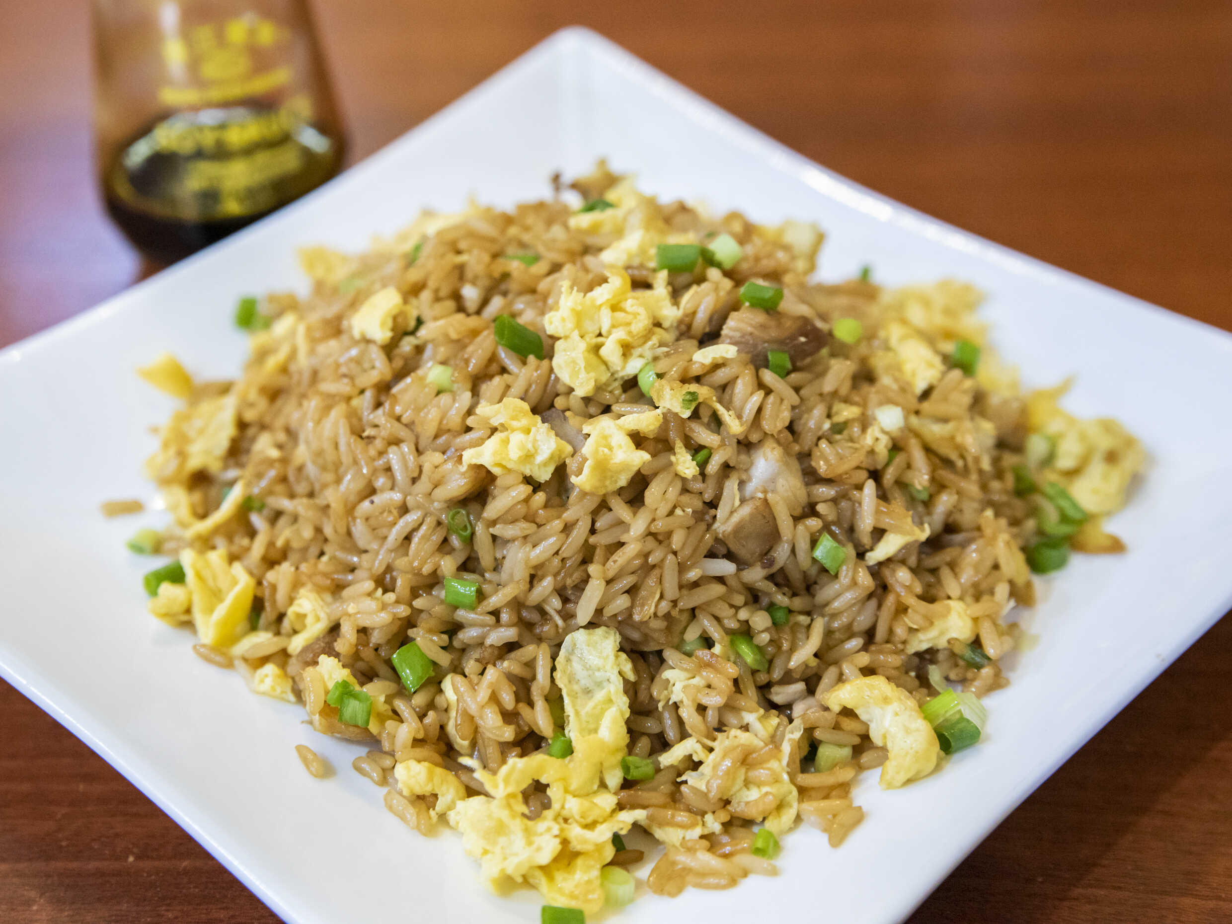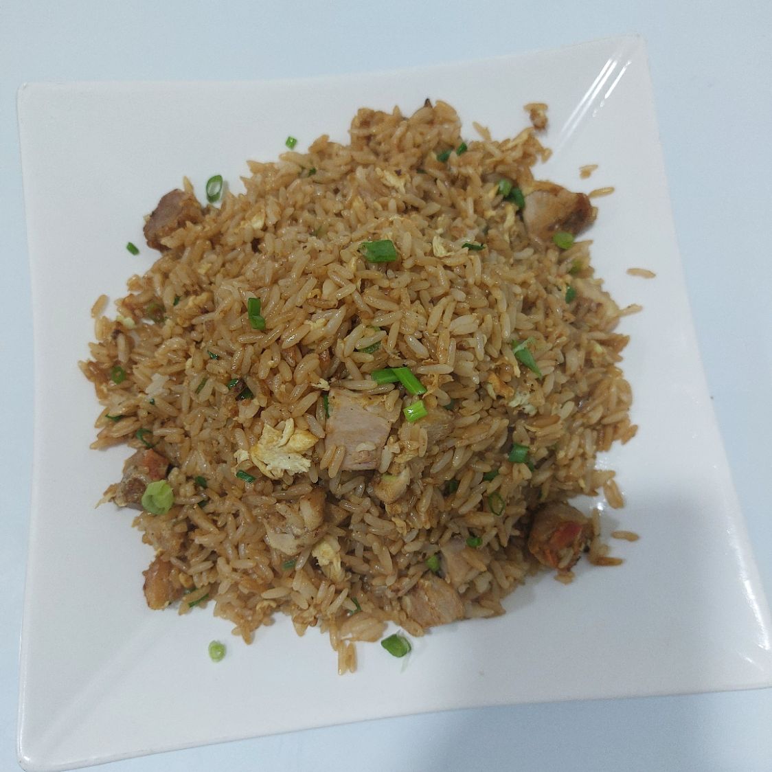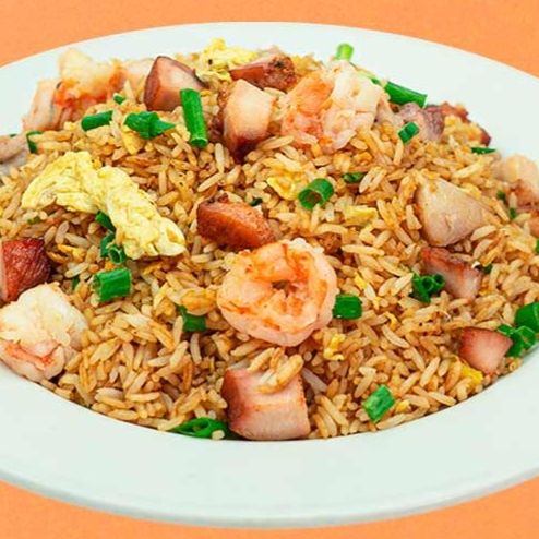 Arroz, pollo ,chancho langostino cebolla china, huevo,sillao