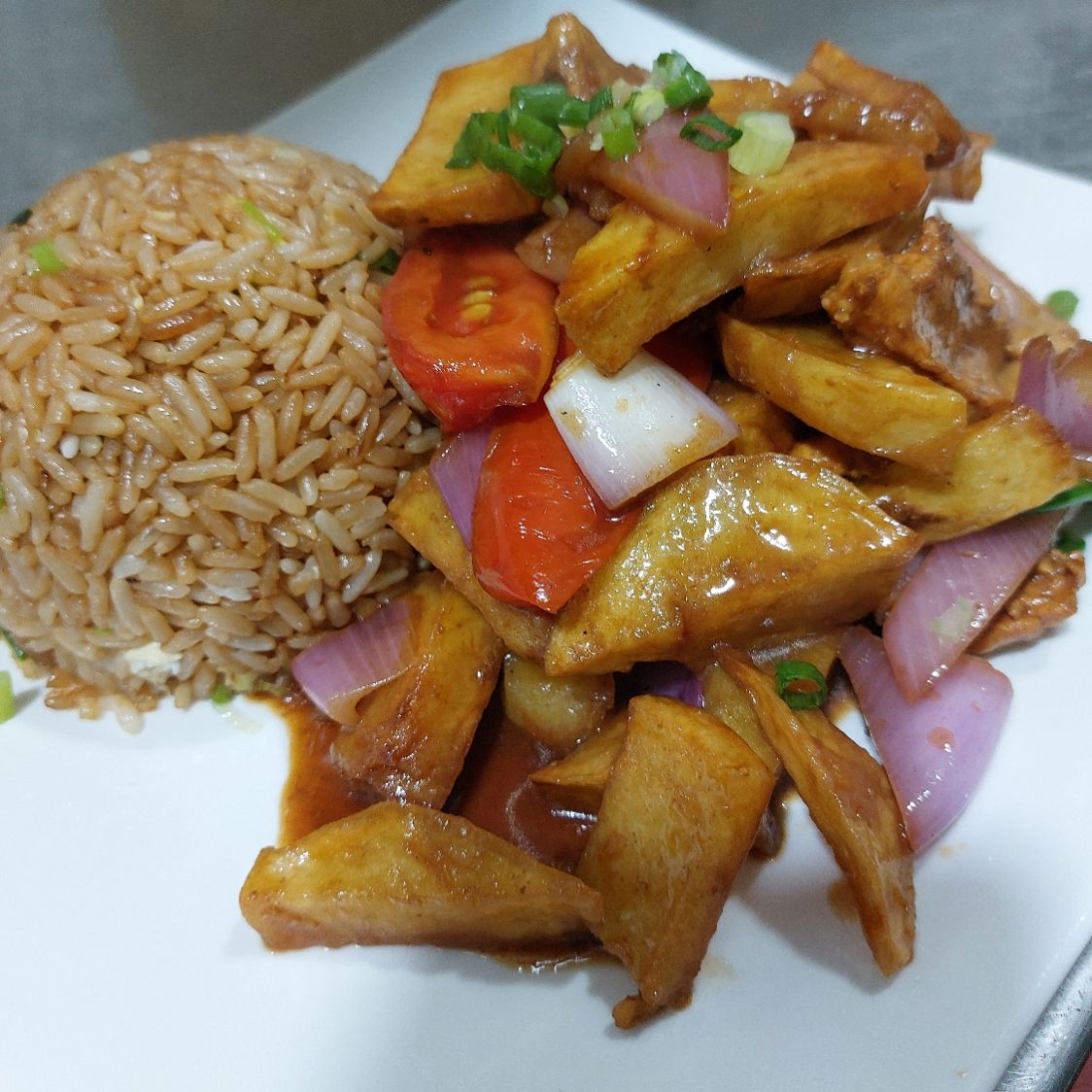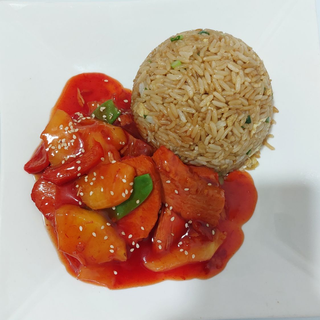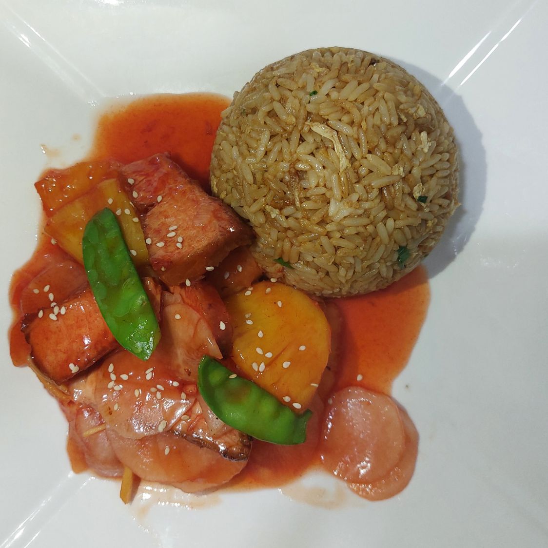 Chaufa, trozos de chancho acompañados con dulce piña.