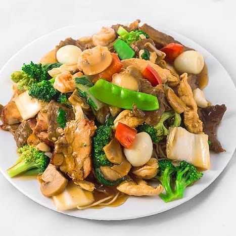 Tallarines, pollo, langostino ,chancho,huevo de codorniz verduras chinas, chanpiñones y salsa de ostión.