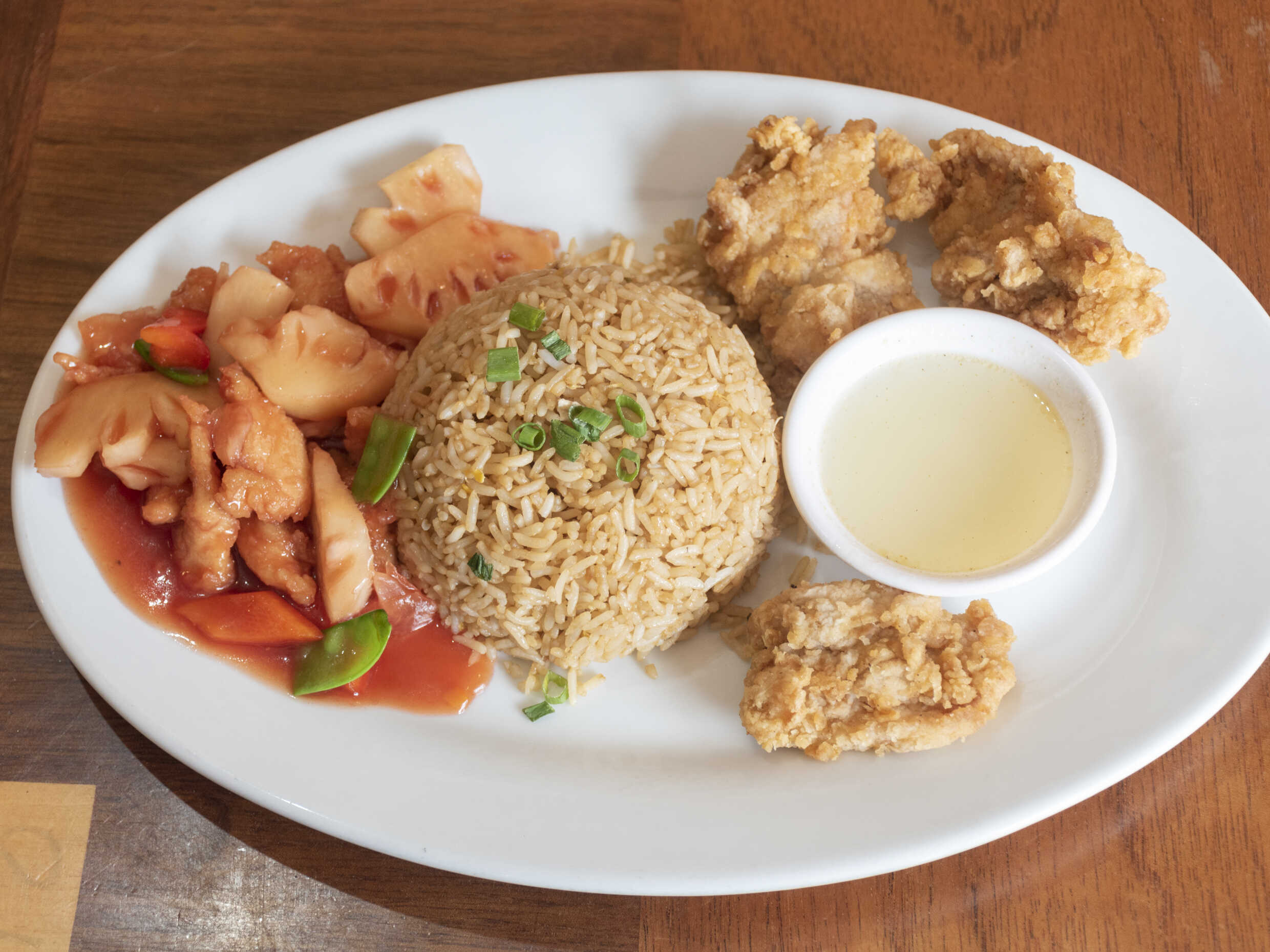 Mitad arroz chaufa, mitad tallarín con verduras y pollo en trozos.