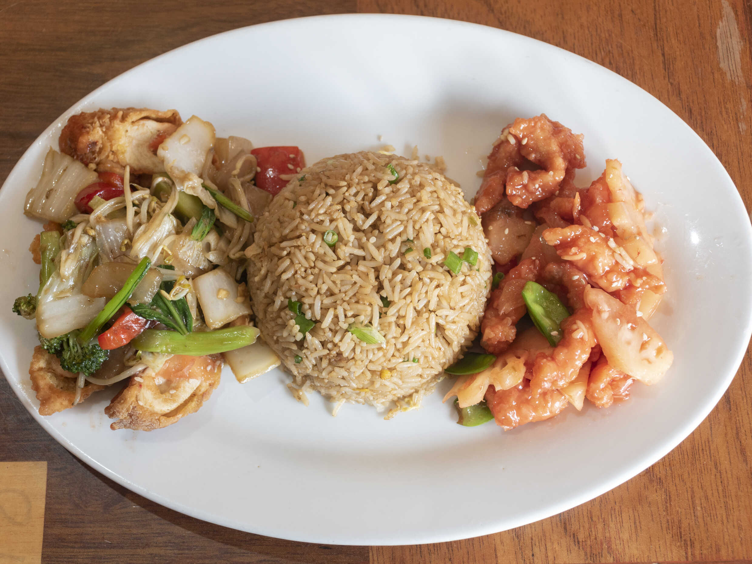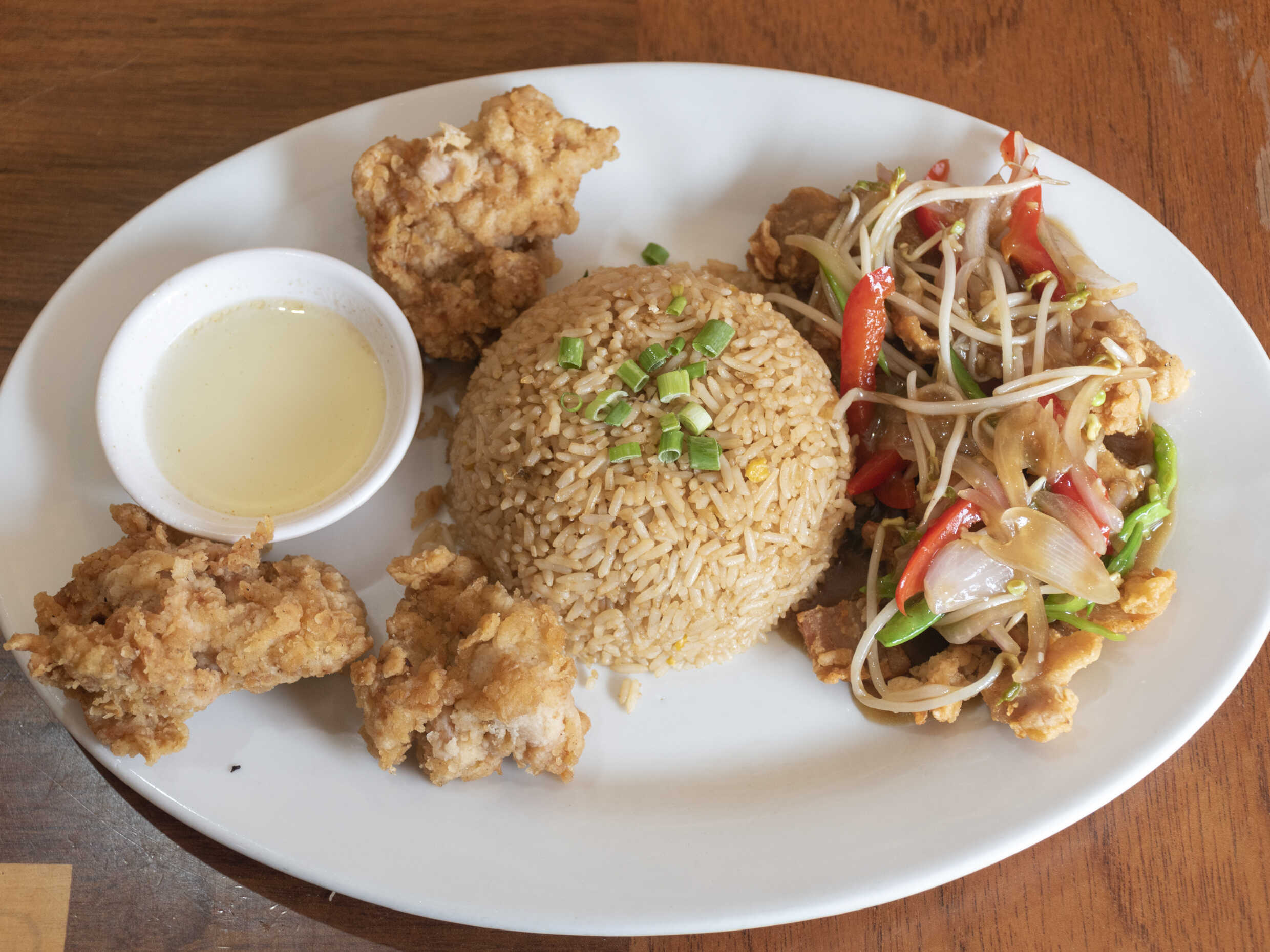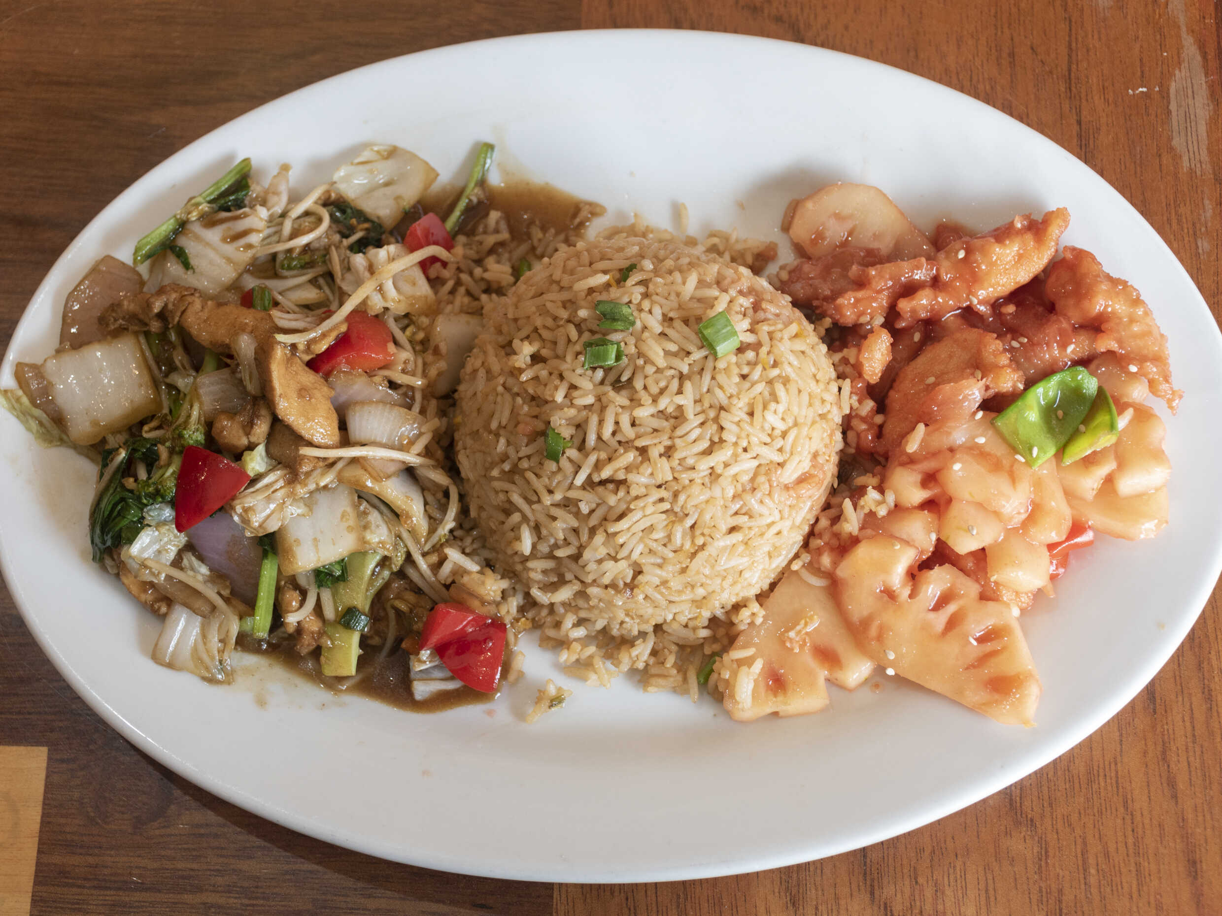 Mitad arroz chaufa, mitad tallarín con verduras y carne.