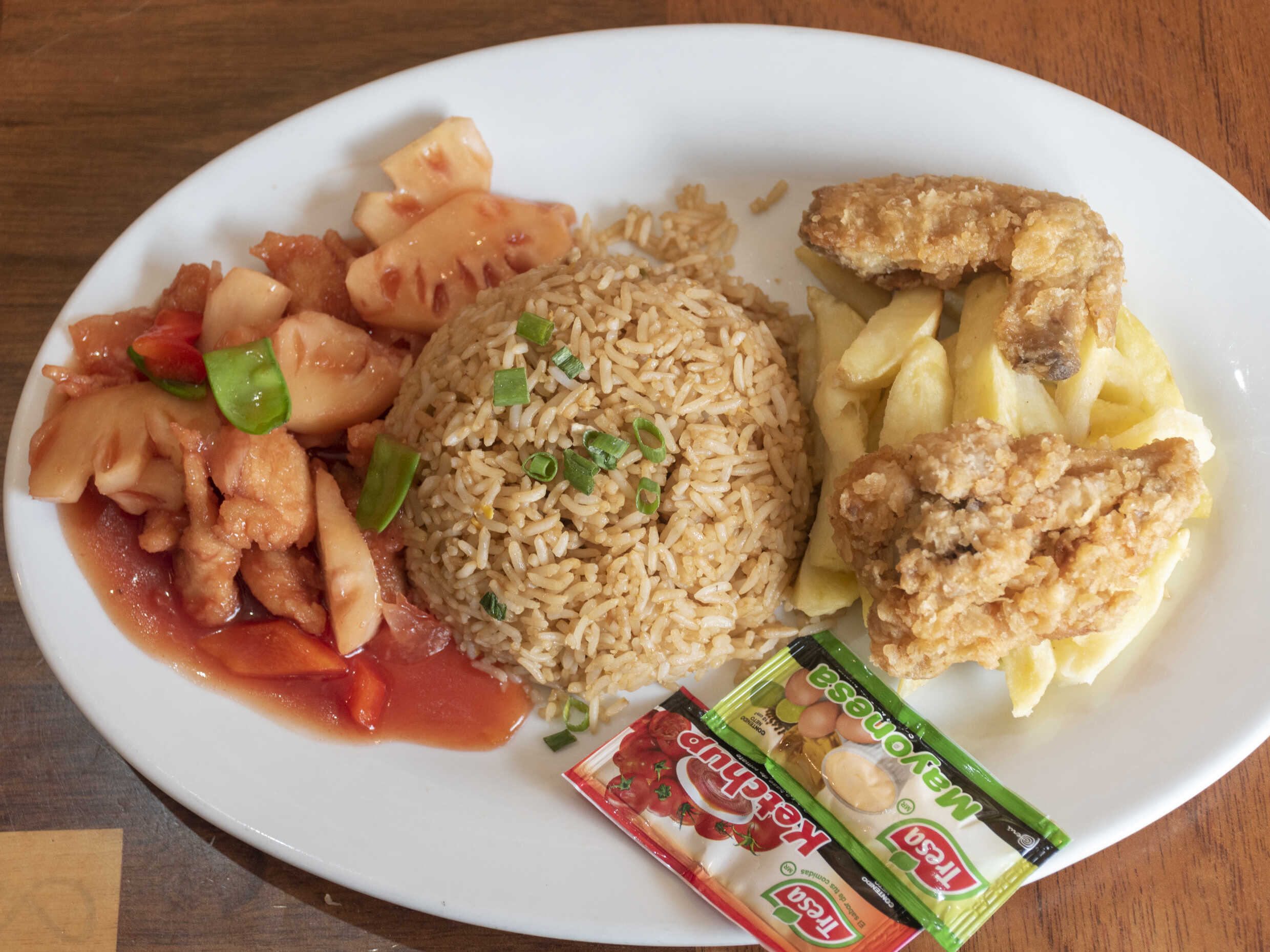 Porción de chaufa, pollo frito y jugo de limón dulce.