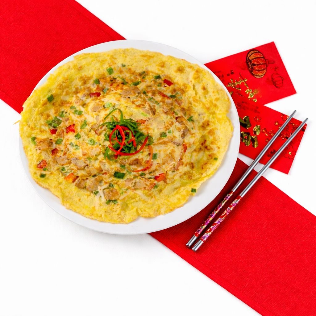 Porción de arroz cubierto con una tortilla de pollo y verduras.