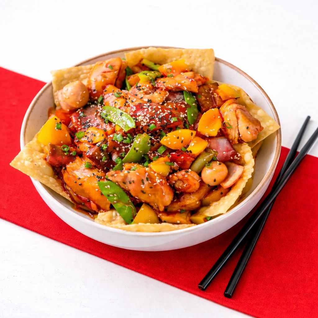 Chancho, pollo salteado en salsa de tamarindo, acompañados de wantán frito.