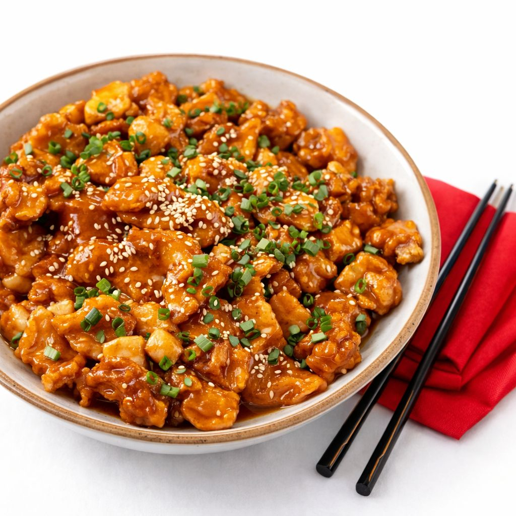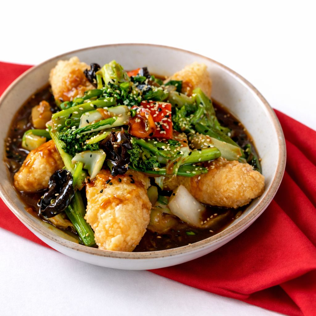 Trozos de muslo de pollo crocante y arrebozado en salsa de ostión.