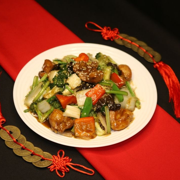 Pollo con verduras saltado con tallarín y arroz chaufa.