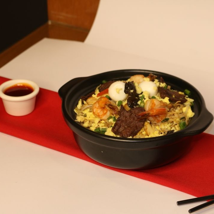 Tallarín saltado de pollo, chancho, carne, langostino y huevito de codorniz.