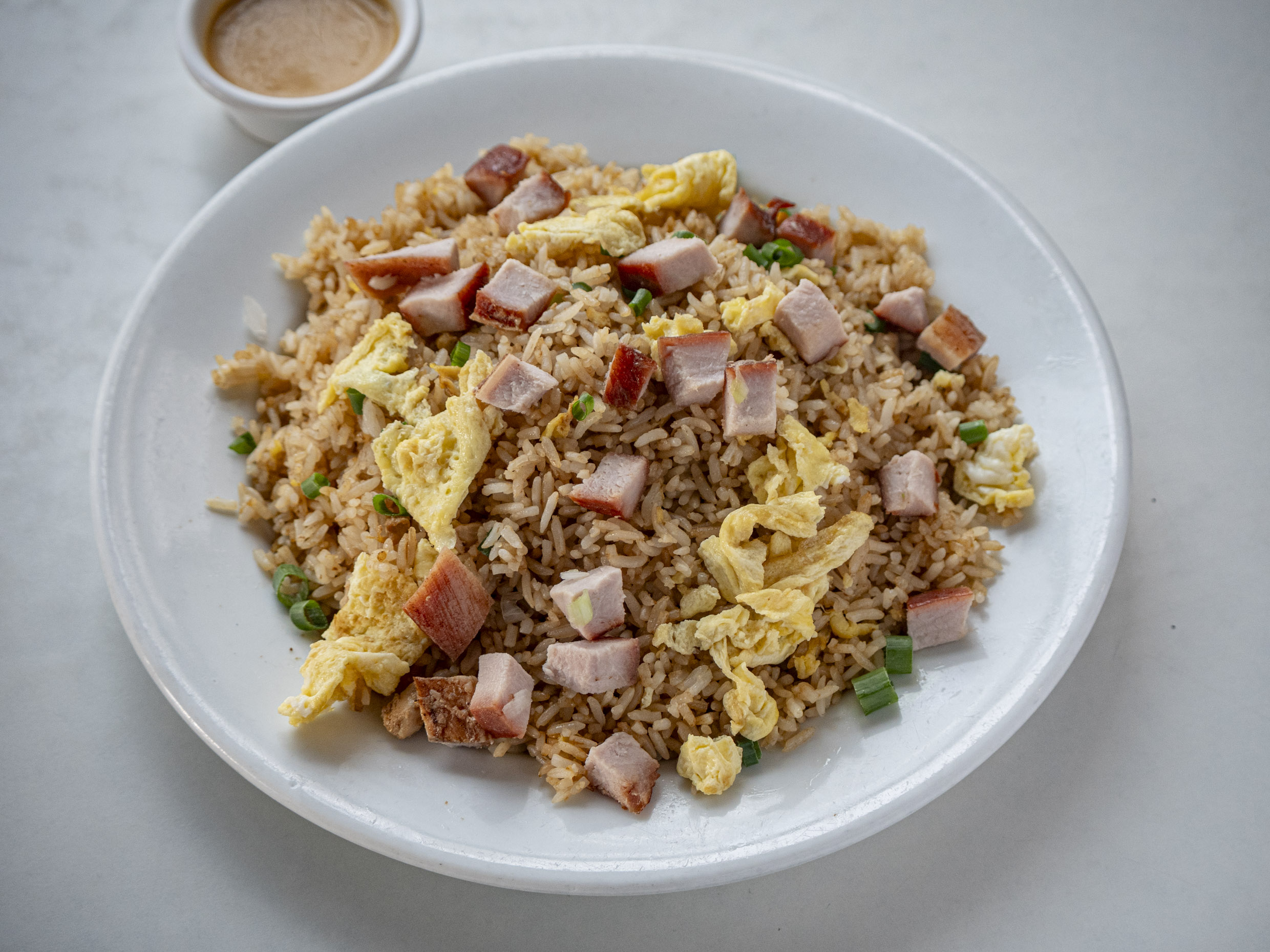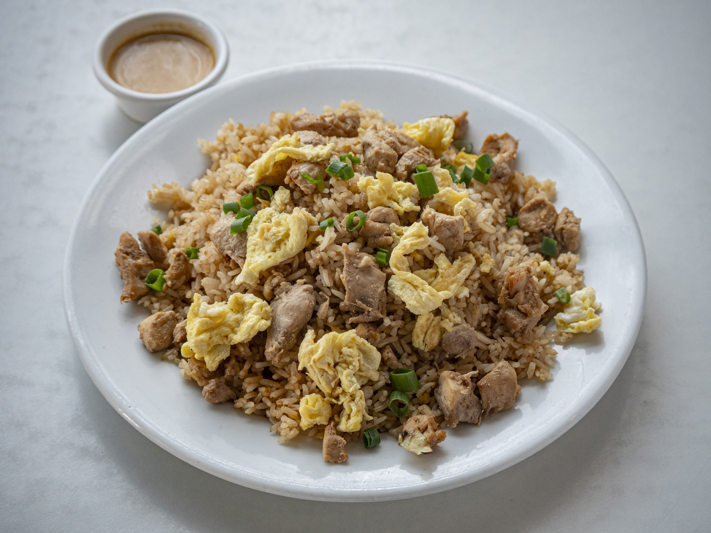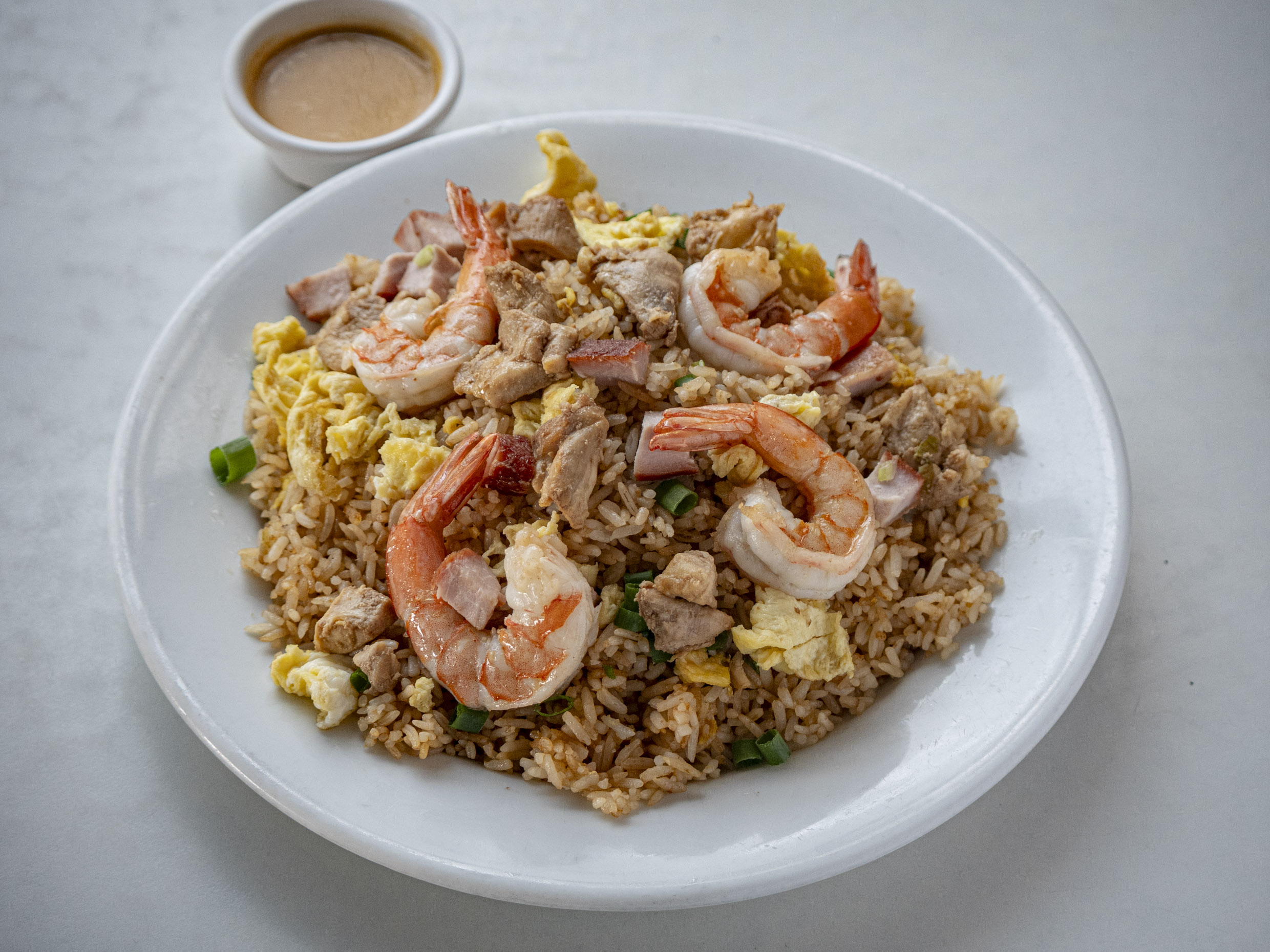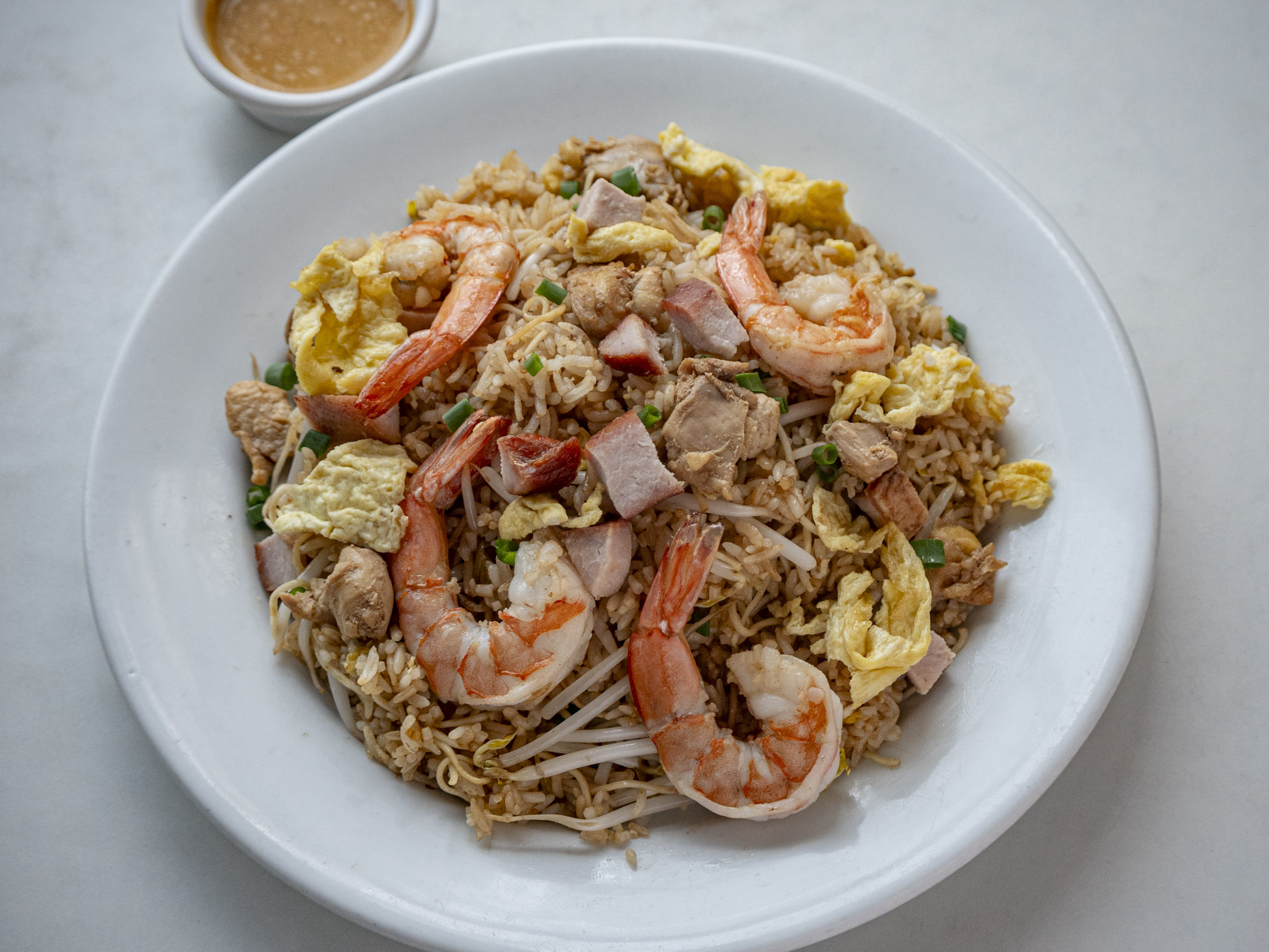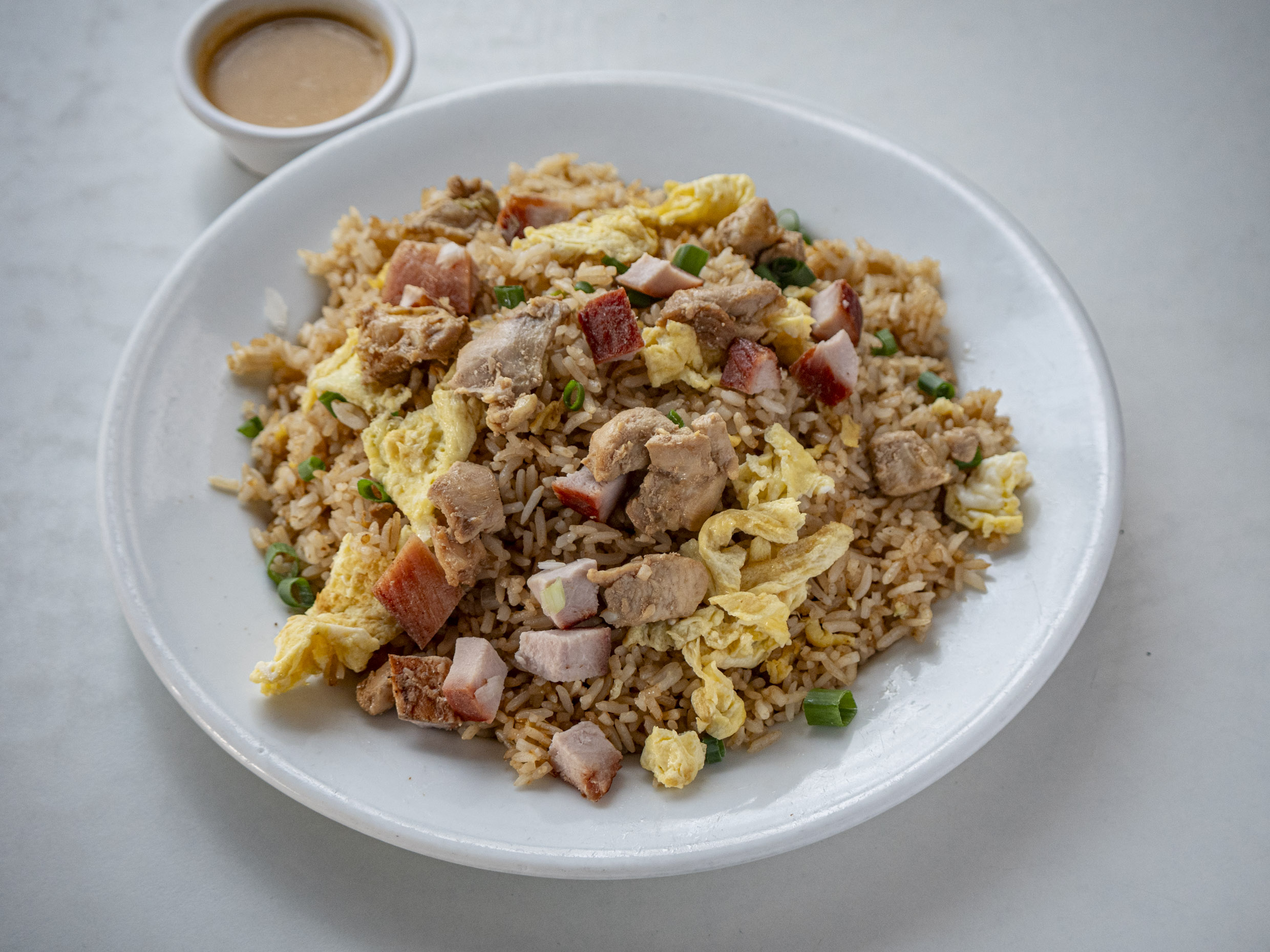 Chaufa con pollo, chancho, extra huevo y un toque adicional de ingredientes especiales.
