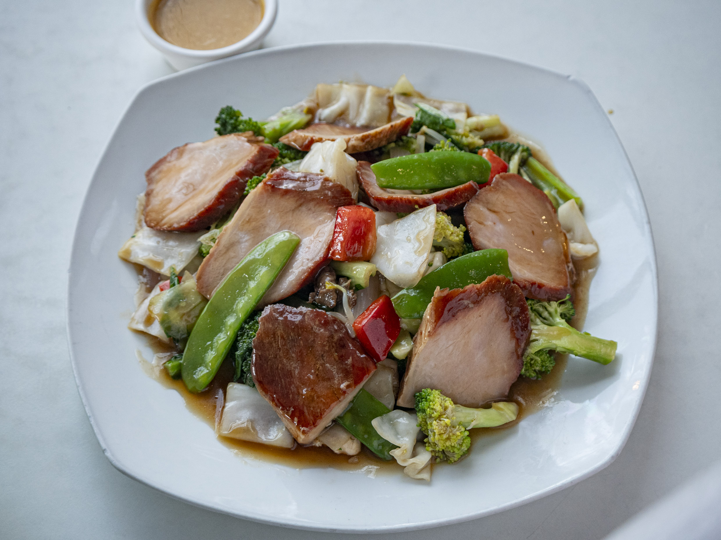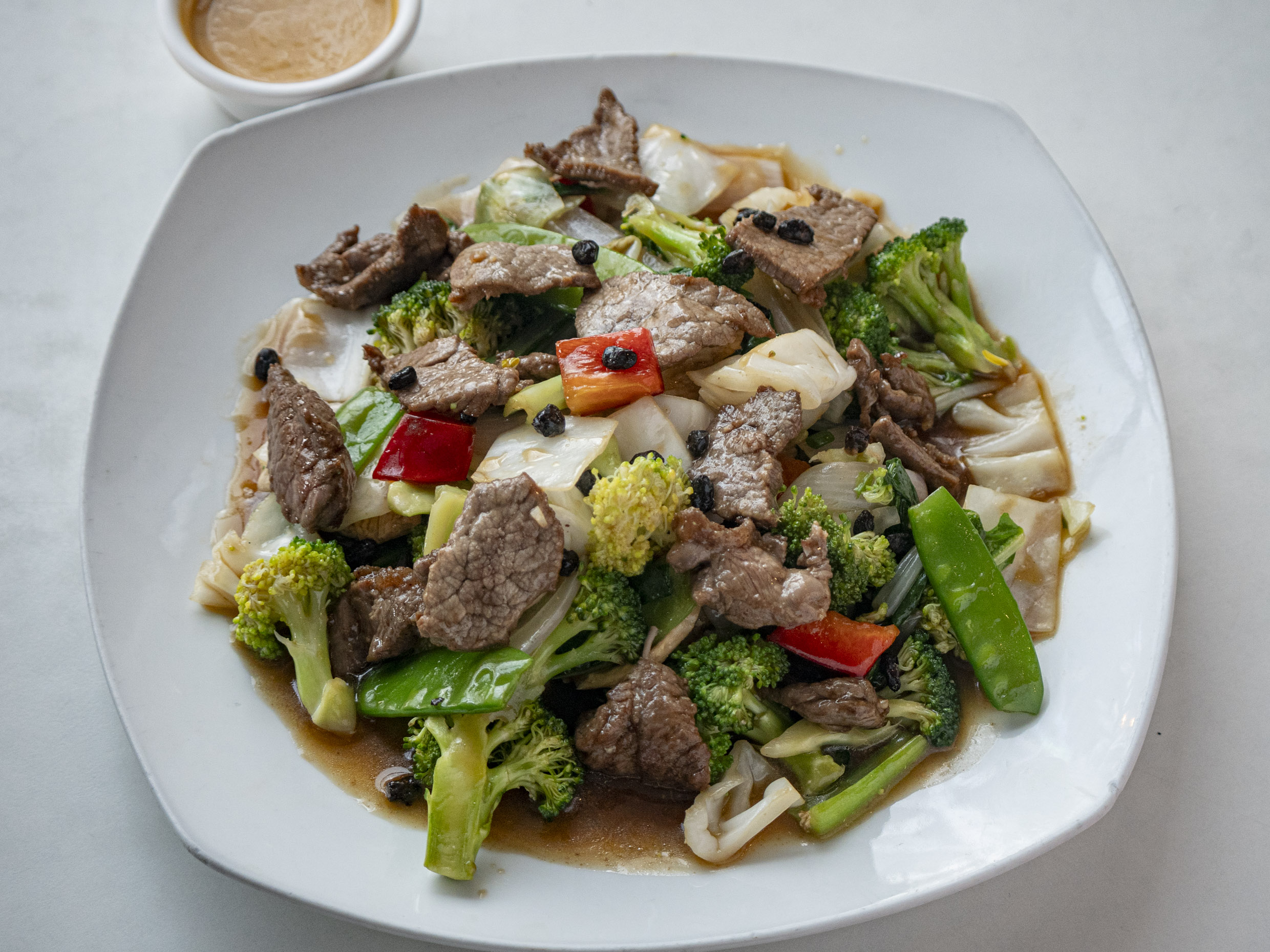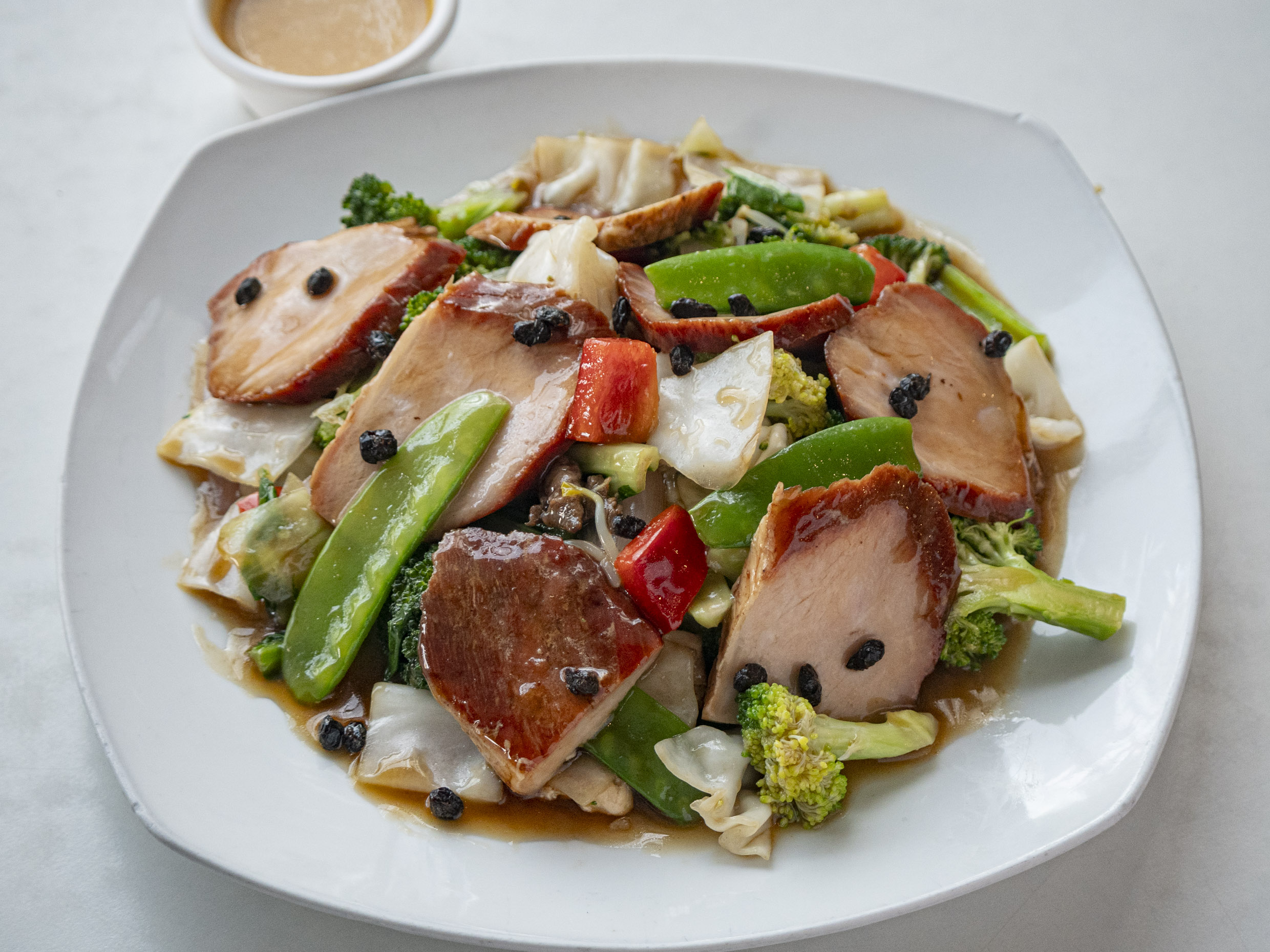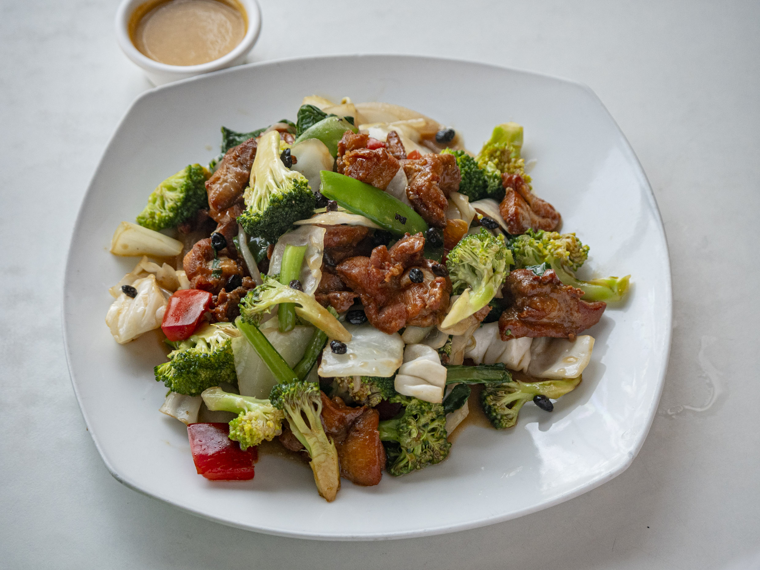 Fuente personal de carne salteado con verduras y tausi.