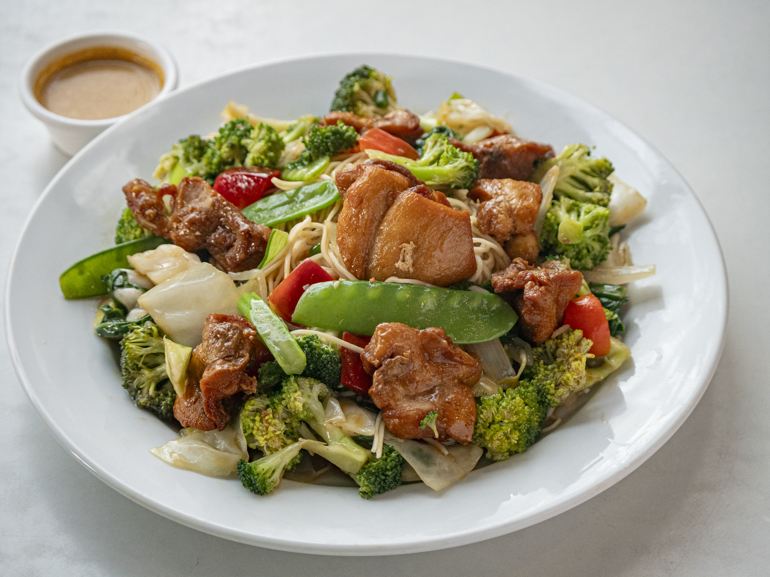 Fuente personal de Tallarin con pollo frito salteado con verduras.