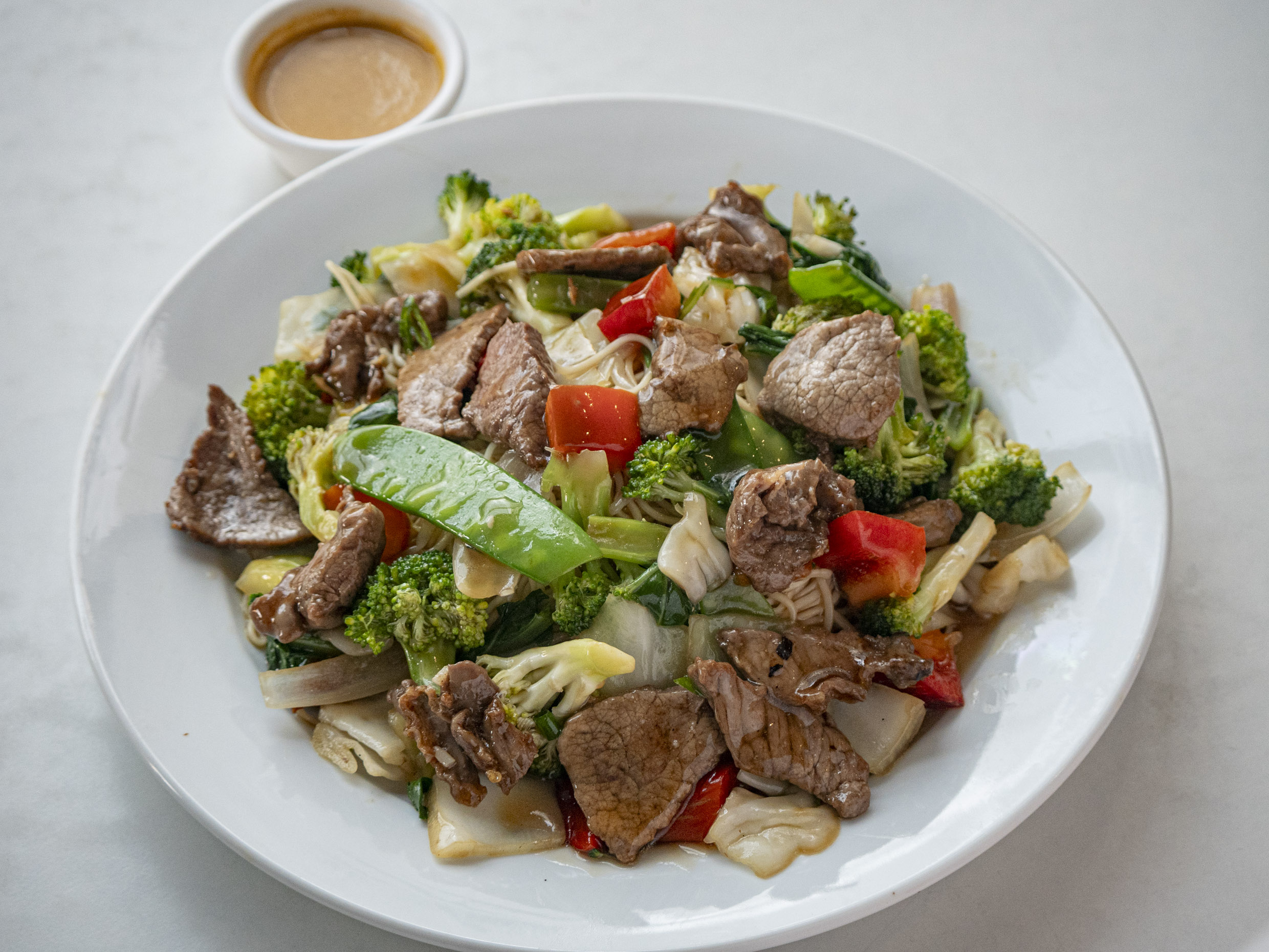 Fideo chino Sahofan salteado con carne de res y vegetales seleccionados.