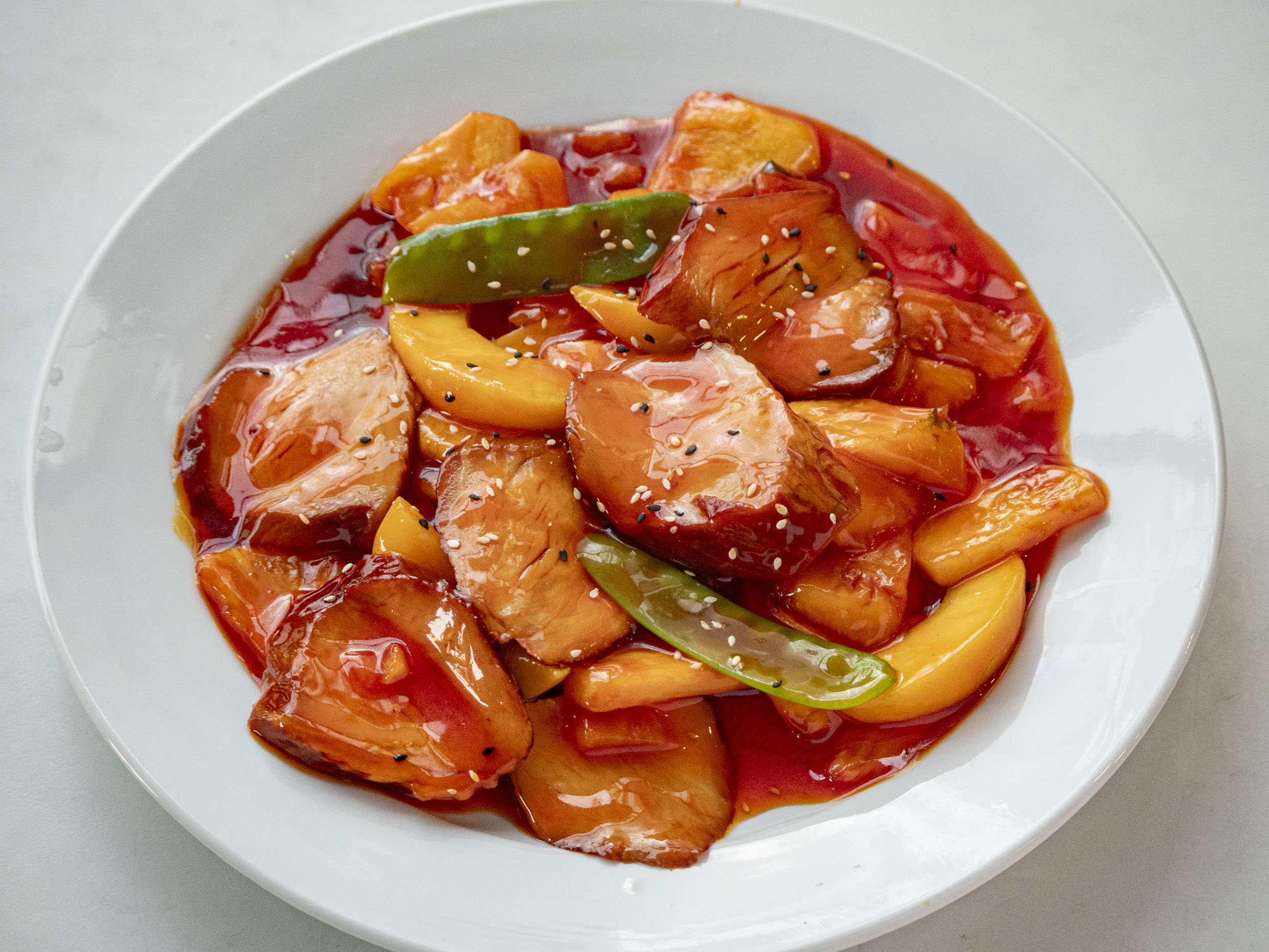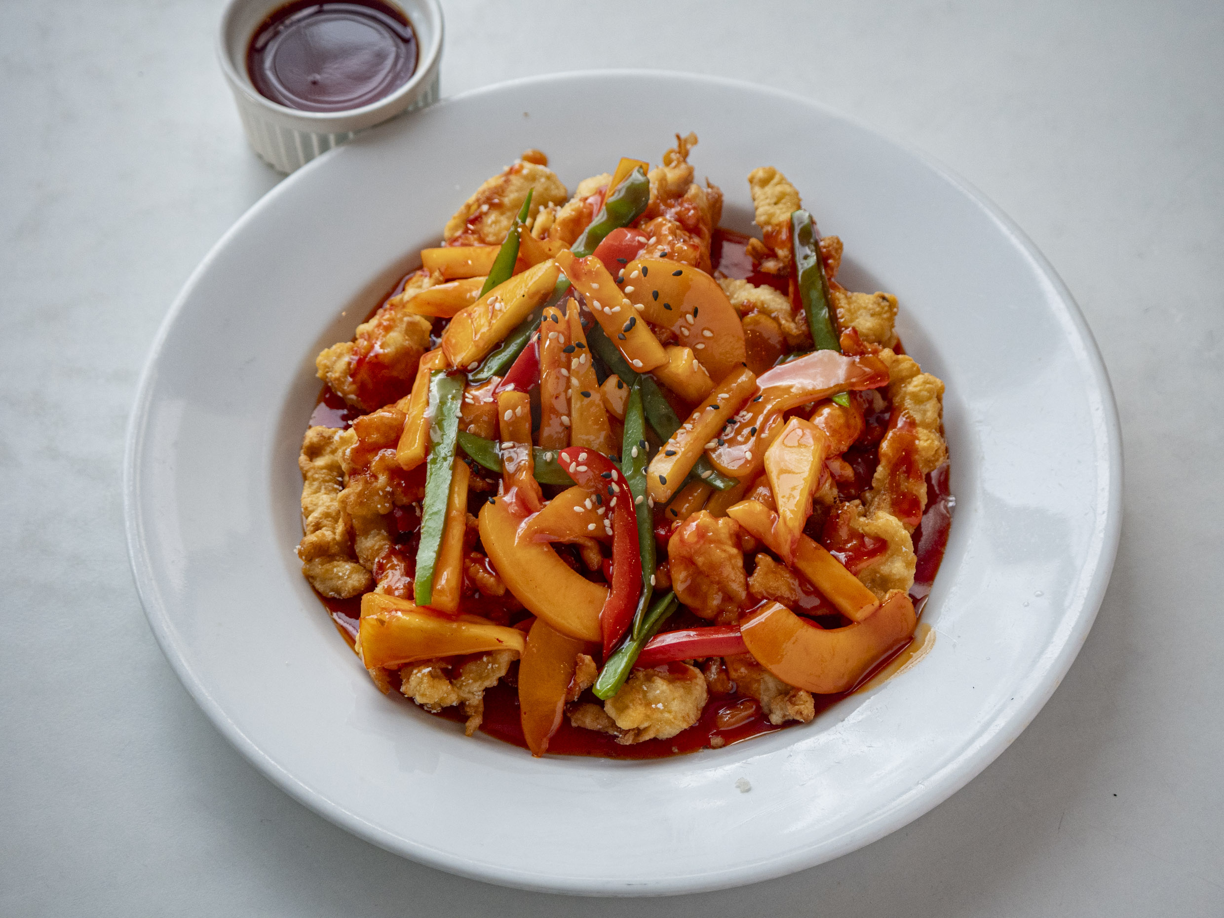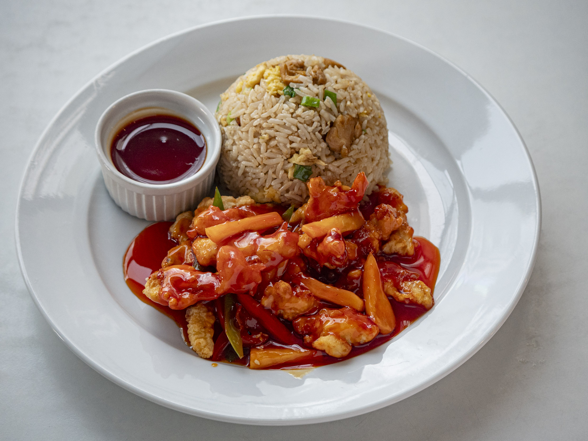 Fuente personal de pollo empanizado cubierto de salsa agridulce hecha a base de limón.