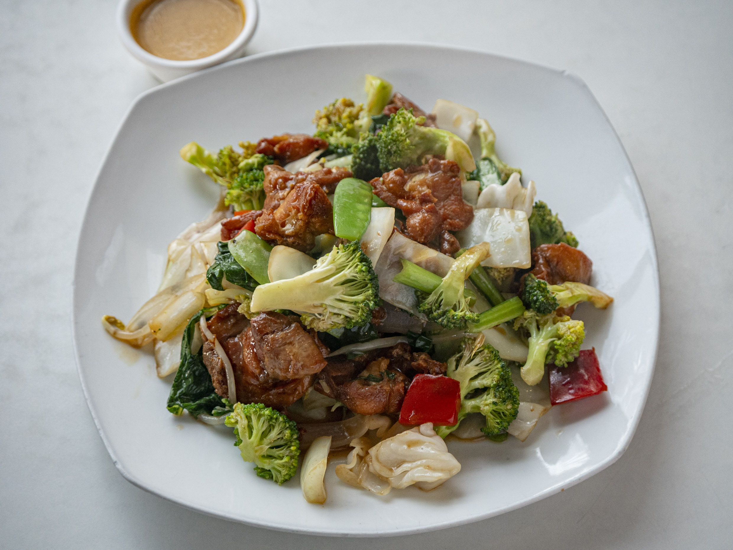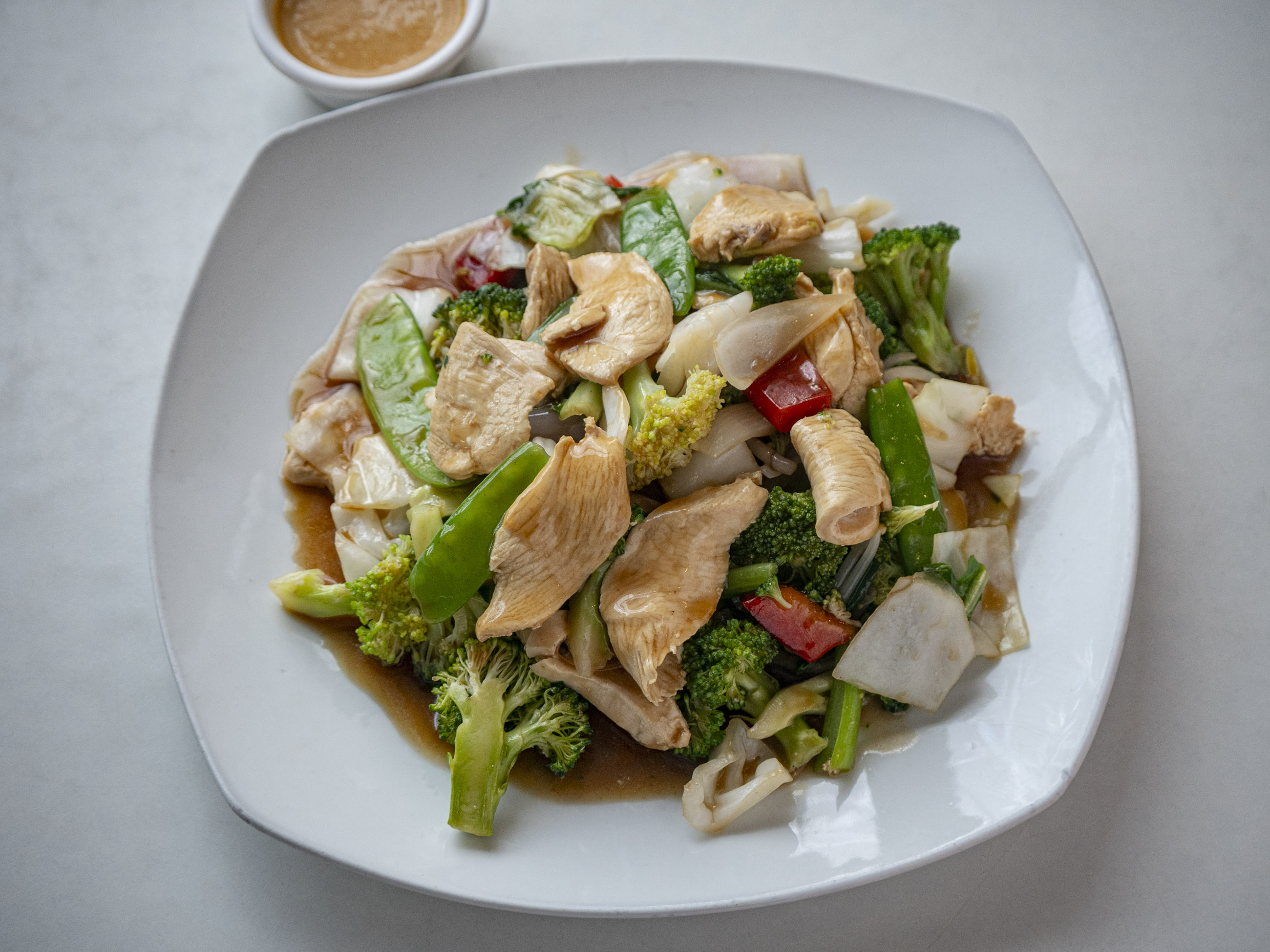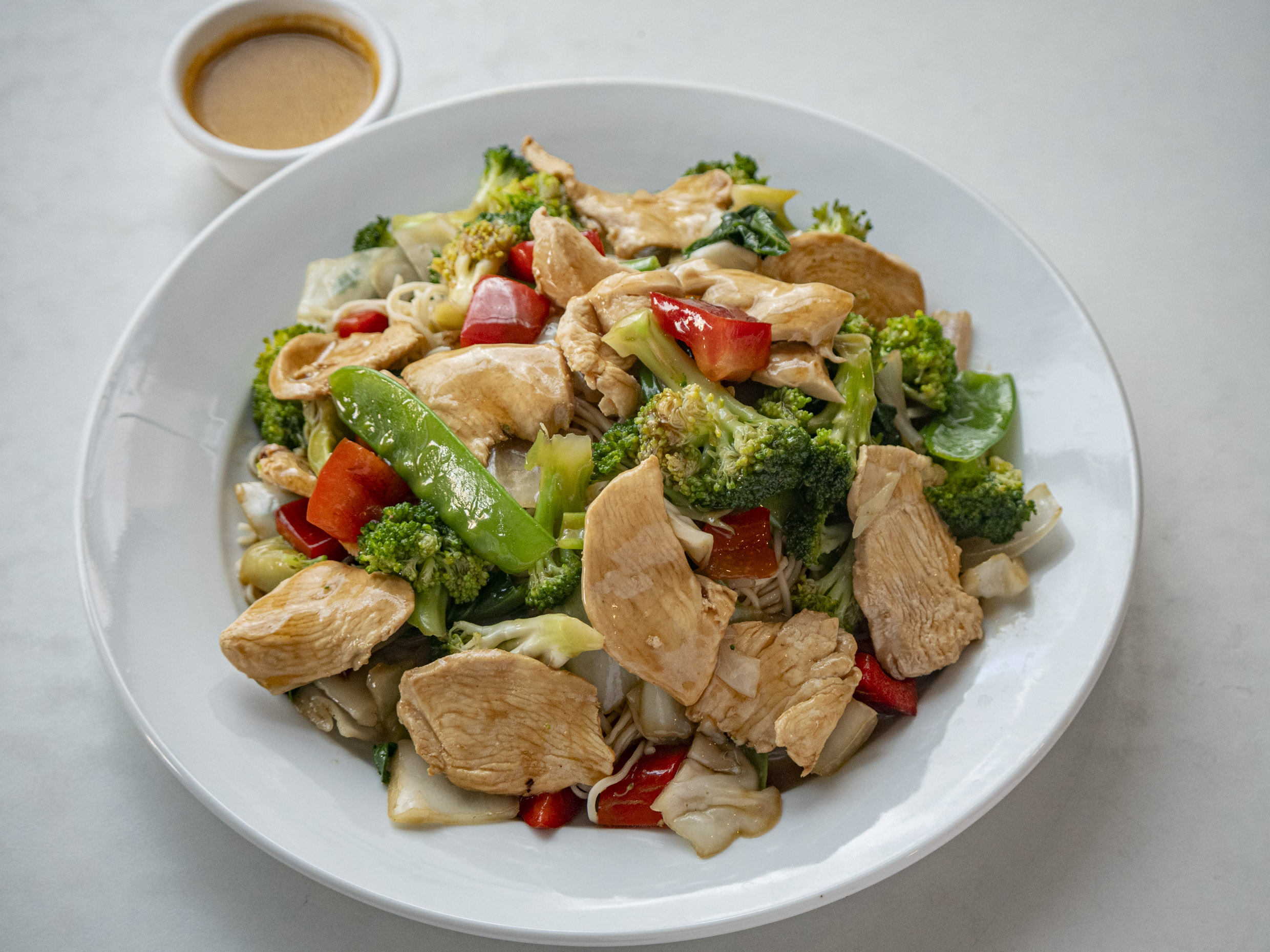 Fuente personal de Tallarin con pollo salteado con verduras.